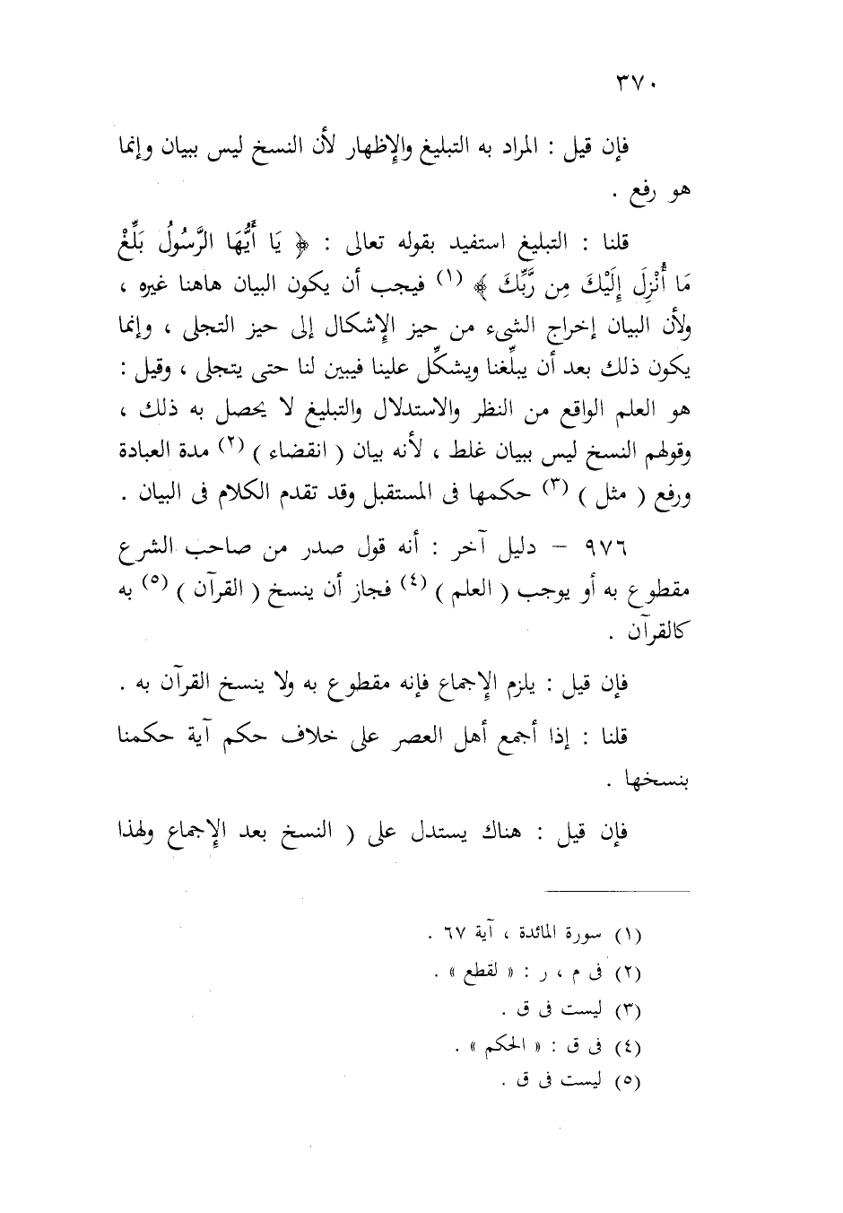 ٩٧٦ - دليل آخر: أنه قول صدر من صاحب الشرع مقطوع به أو يوجب (العلم) فجاز أن ينسخ (القرآن) به كالقرآن.