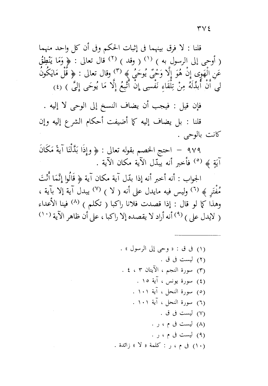 ٩٧٩ - احتج الخصم بقوله تعالى: {وَإِذَا بَدَّلْنَا آيَةً مَكَانَ آيَةٍ} فأخبر أنه يبدل الآية مكان الآية.