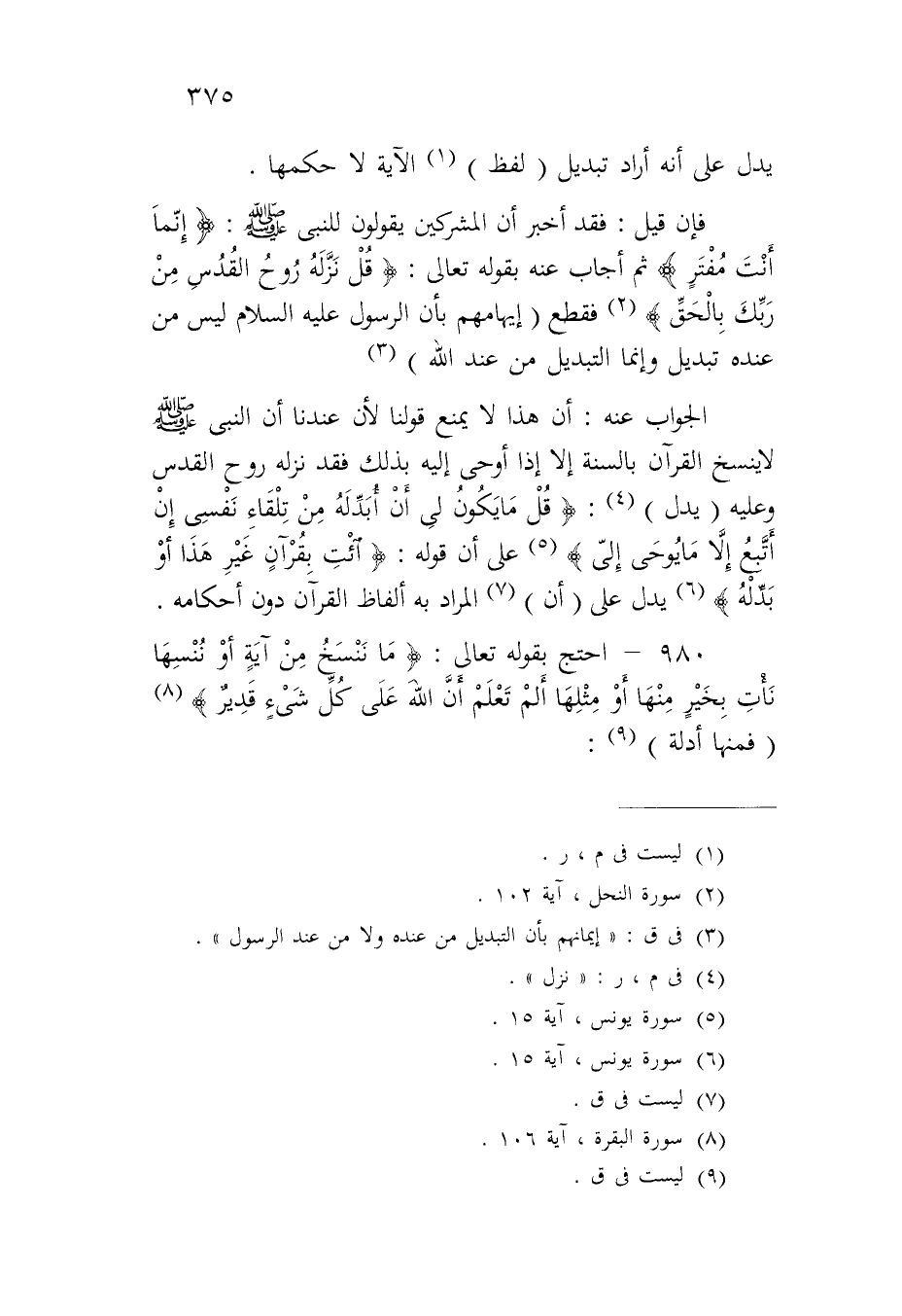 ٩٨٠ - احتج بقوله تعالى: {مَا نَنسَخْ مِنْ آيَةٍ أَوْ نُنسِهَا نَاتِ بِخَيْرٍ مِنْهَا أَوْ مِثْلِهَا أَلَمْ تَعْلَمْ أَنَّ اللَّهَ عَلَى كُلِّ شَيْءٍ قَدِيرٌ} (فمنها أدلة):