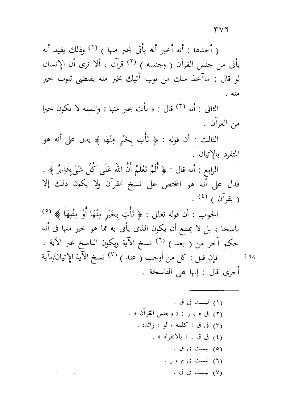 الرابع: أنه قال: {نَاتِ بِخَيْرٍ مِنْهَا أَوْ مِثْلِهَا} ناسخاً، بل لا يمتنع أن يكون الذي يأتي به مما هو خير منها في أنه حكم آخر من (بعد) نسخ الآية ويكون الناسخ غير الآية.