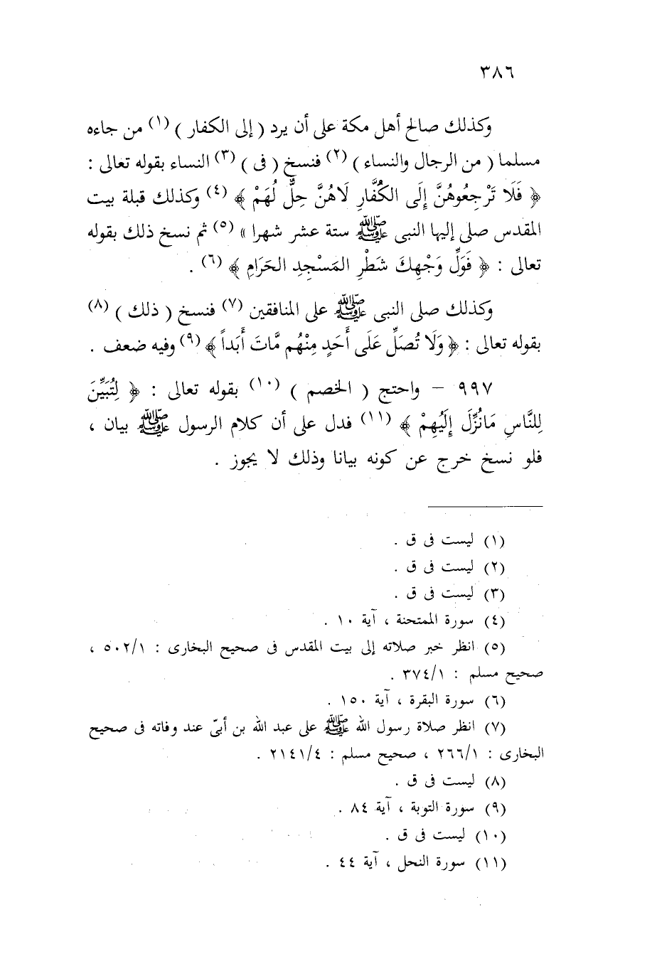 وكذلك صالح أهل مكة على أن يرد (إلى الكفار) من جاءه مسلماً (من الرجال والنساء) فنسخ (في) النساء بقوله تعالى: {فَلا تَرْجِعُوهُنَّ إِلَى الْكُفَّارِ لا هُنَّ حِلٌّ لَهُمْ} وكذلك قبلة بيت المقدس صلى إليها النبي صلى الله عليه وسلم ستة عشر شهراً" ثم نسخ ذلك بقوله تعالى: {فَوَلِّ وَجْهَكَ شَطْرَ الْمَسْجِدِ الْحَرَامِ}.