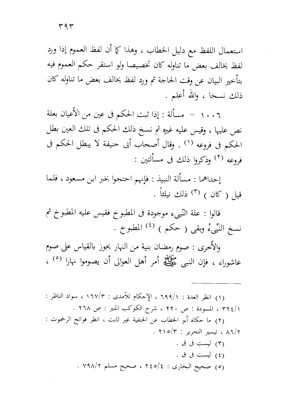 ١٠٠٦ - مسألة: إذا ثبت الحكم في عين من الأعيان بعلة نص عليها، وقيس عليه غيره ثم نسخ ذلك الحكم في تلك العين بطل الحكم في فروعه. وقال أصحاب أبي حنيفة لا يبطل الحكم في فروعه وذكروا ذلك في مسألتين.