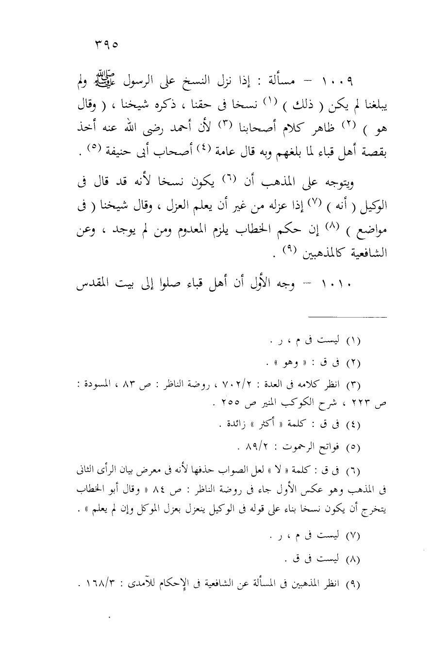 ١٠٠٩ - مسألة: إذا نزل النسخ على الرسول صلى الله عليه وسلم ولم يبلغنا لم يكن (ذلك) نسخاً في حقنا، ذكره شيخنا، (وقال هو) ظاهر كلام أصحابنا لأن أحمد رضي الله عنه أخذ بقصة أهل قباء لما بلغهم وبه قال عامة أصحاب أبي حنيفة.