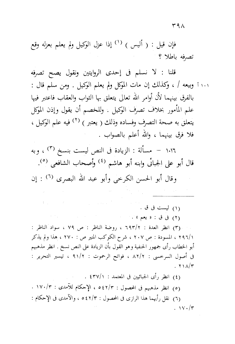 قلنا: لا نسلم في إحدى الروايتين ونقول يصح تصرفه وبيعه/١٠١ أ، وكذلك إن مات الموكل ولم يعلم الوكيل. ومن سلم قال: بالفرق بينهما لأن أوامر الله تعالى يتعلق بها الثواب والعقاب فاعتبر فيها علم المأمور بخلاف تصرف الوكيل. وللخصم أن يقول وإذن الموكل يتعلق به صحة التصرف وفساده وذلك (يعتبر) فيه علم الوكيل، فلا فرق بينهما، والله أعلم بالصواب.
