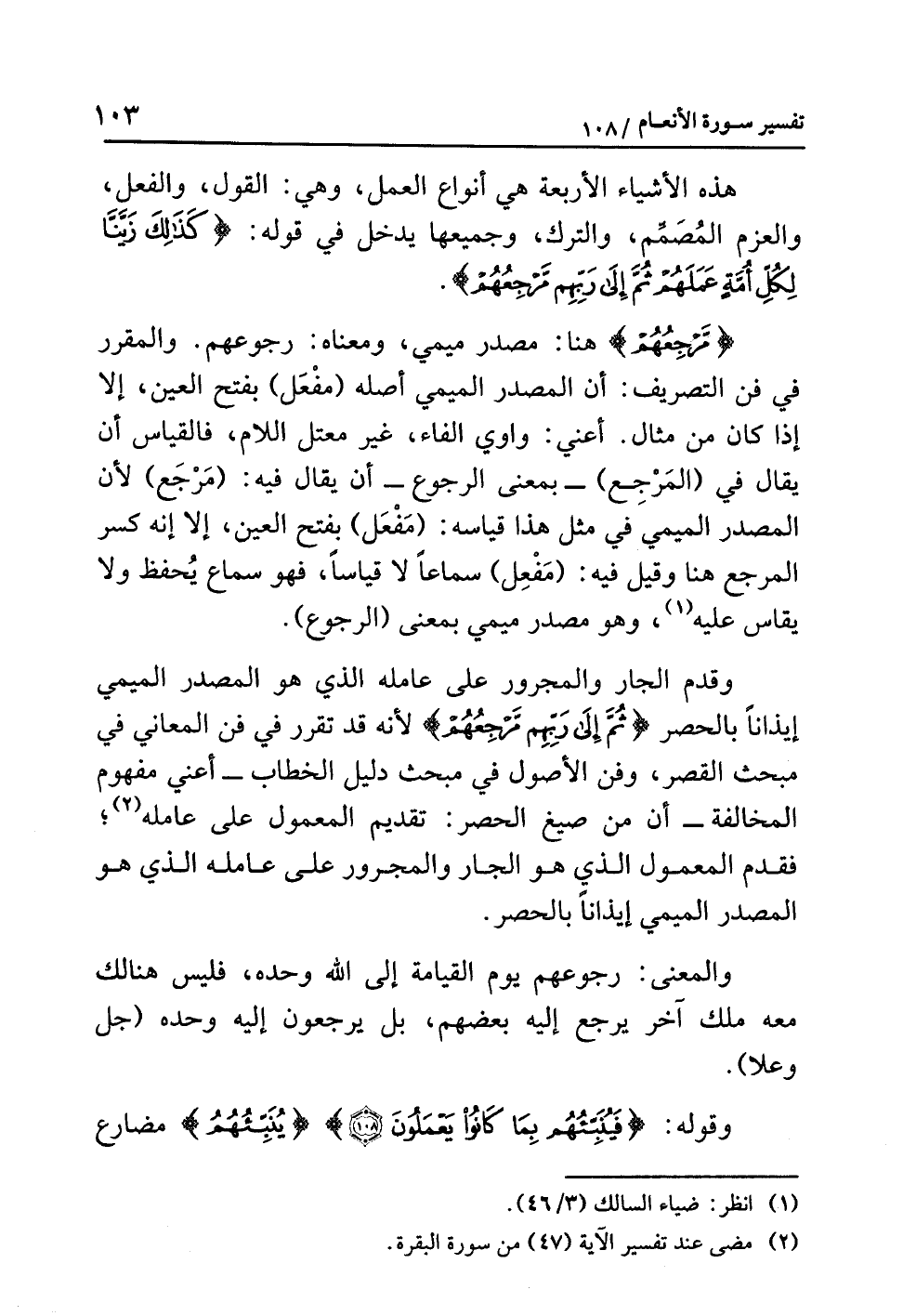 وَقَدَّمَ الجارَّ والمجرورَ على عاملِه الذي هو المصدرُ الميميُّ إِيذَانًا بالحصرِ: {ثُمَّ إِلَى رَبِّهِم مَّرْجِعُهُمْ} لأنه قد تَقَرَّرَ في فَنِّ المعانِي في مبحثِ القصرِ، وفنِّ الأصولِ في مبحثِ دليلِ الخطابِ - أعنِي مفهومَ المخالفةِ - أن مِنْ صِيَغِ الحصرِ: تقديمَ المعمولِ على عَامِلِهِ (¬2)؛ فَقَدَّمَ المعمولَ الذي هو الجارُّ والمجرورُ على عاملِه الذي هو المصدرُ الميميّ إيذانًا بالحصرِ.