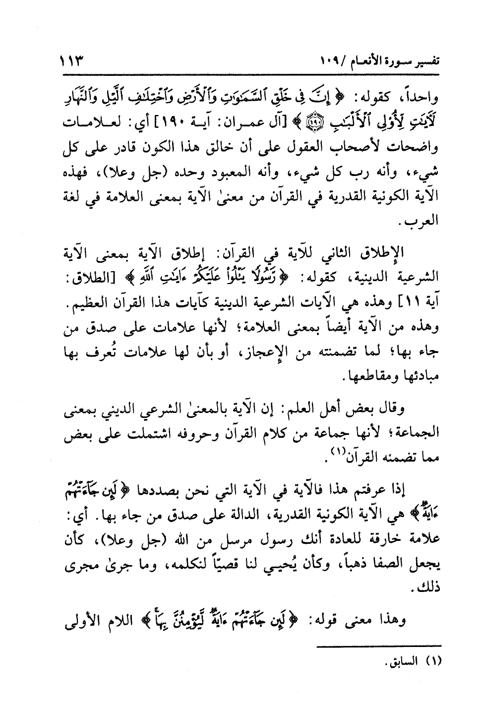 واحدًا، كقولِه: {إِنَّ فِي خَلْقِ السَّمَاوَاتِ وَالأَرْضِ وَاخْتِلاَفِ اللَّيْلِ وَالنَّهَارِ لآيَاتٍ لِّأُوْلِي الأَلْبَابِ (190)} [آل عمران: آية 190] أي: لعلاماتٍ واضحاتٍ لأصحابِ العقولِ على أن خالقَ هذا الكونِ قادرٌ على كُلِّ شَيْءٍ، وأنه رَبُّ كُلِّ شيءٍ، وأنه المعبودُ وحدَه (جل وعلا)، فهذه الآيةُ الكونيةُ القدريةُ في القرآنِ من معنَى الآيةِ بمعنَى العلامةِ في لغةِ العربِ.