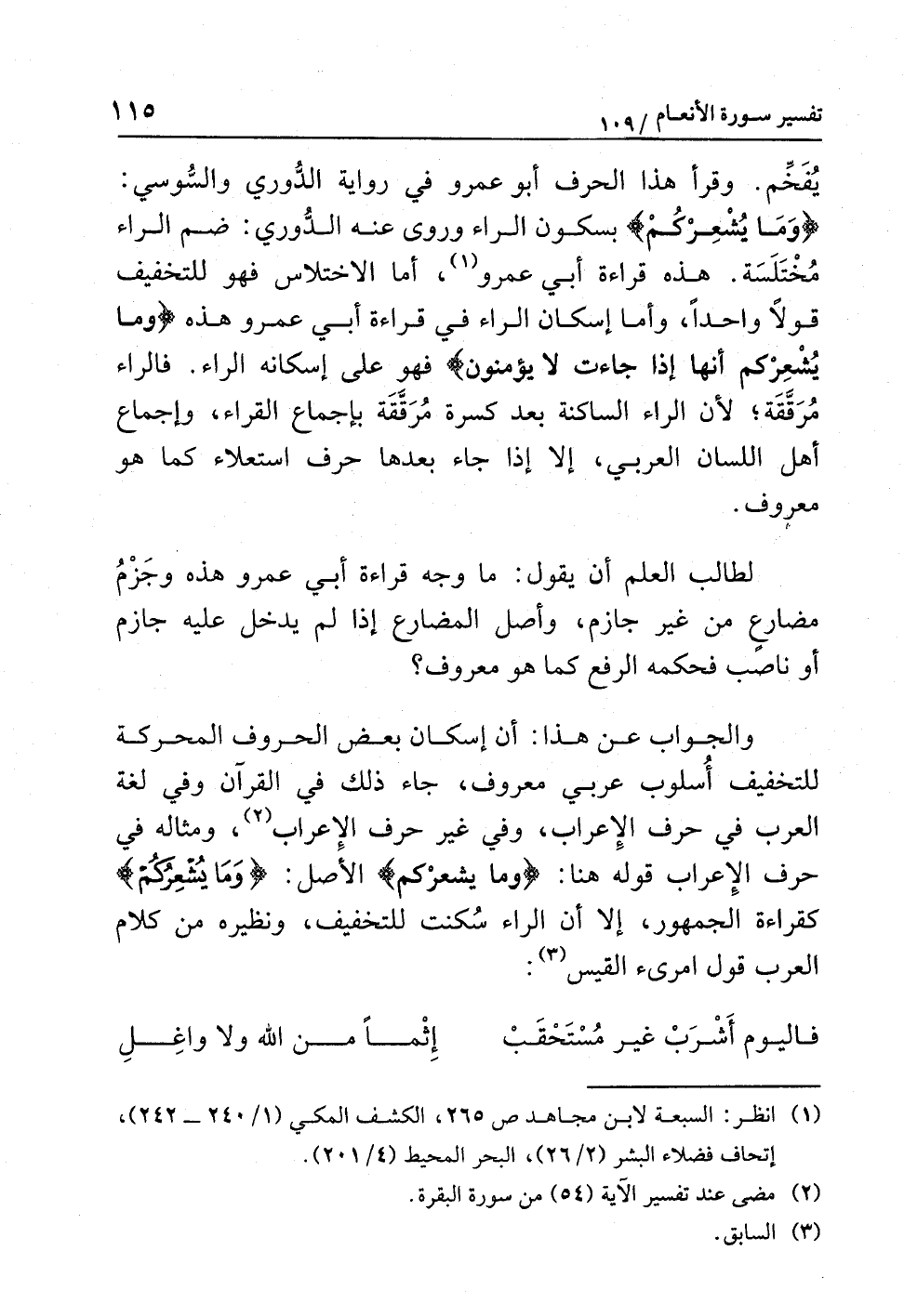 والجوابُ عن هذا: أن إسكانَ بعضِ الحروفِ المحركةِ للتخفيفِ أُسْلُوبٌ عَرَبِيٌّ معروفٌ، جاء ذلك في القرآنِ وفي لغةِ العربِ في حرفِ الإعرابِ، وفي غيرِ حرفِ الإعرابِ (¬2)، ومثالُه في حرفِ الإعرابِ قولُه هنا: {وما يشعرْكم} الأصلُ: {وَمَا يُشْعِرُكُمْ} كقراءةِ الجمهورِ، إلا أن الراءَ سُكِّنَتْ للتخفيفِ، ونظيرُه من كلامِ العربِ قولُ امْرِئِ القيسِ (¬3):