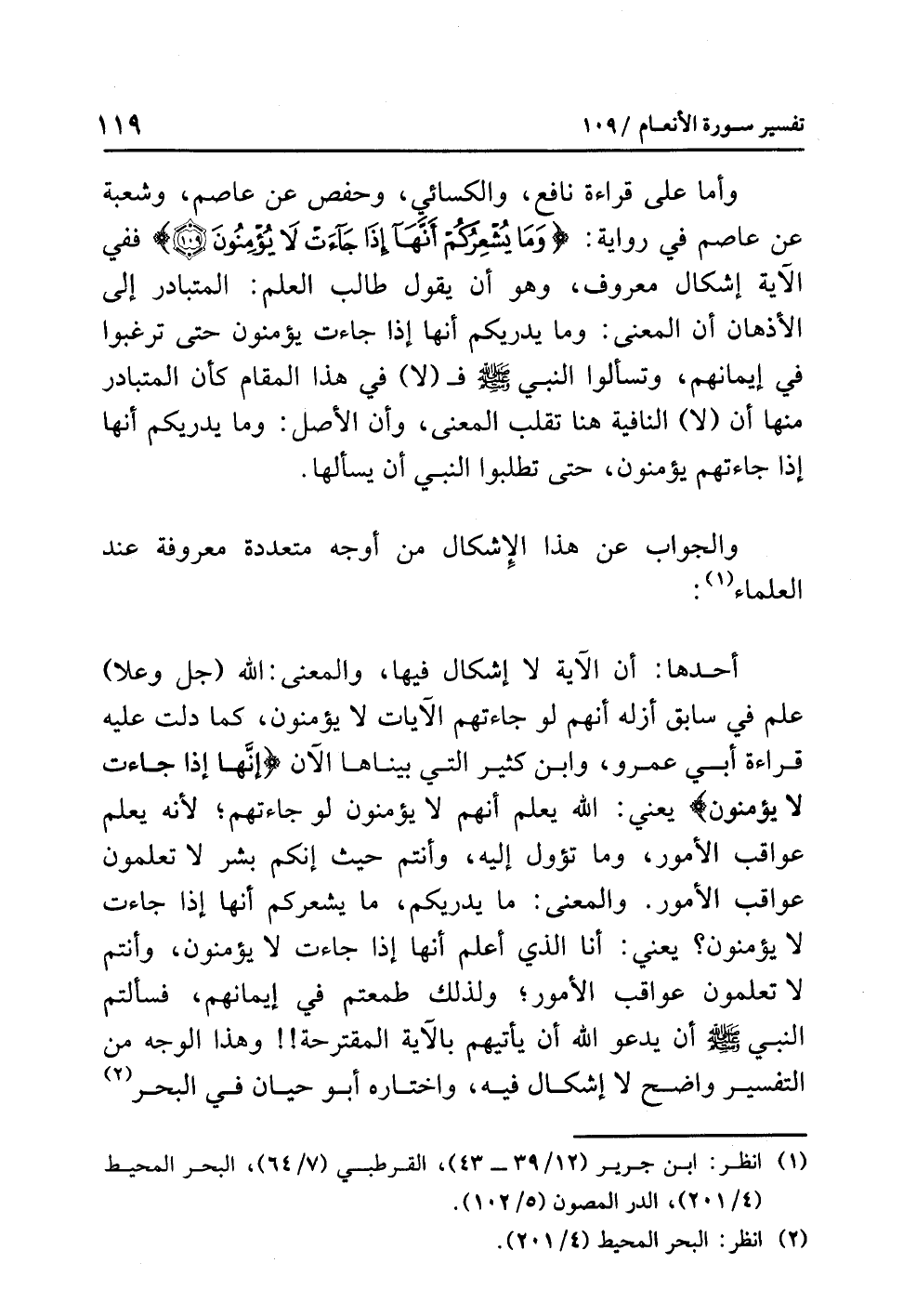 وأما على قراءةِ نافعٍ والكسائيِّ وحفصٍ عن عاصمٍ وشعبةَ عن عاصمٍ في روايةِ: {وَمَا يُشْعِرُكُمْ أَنَّهَا إِذَا جَاءَتْ لاَ يُؤْمِنُونَ (109)} ففي الآيةِ إشكالٌ معروفٌ، وهو أن يقولَ طالبُ العلمِ: المتبادرُ إلى الأذهانِ أن المعنَى: وما يدريكم أنها إذا جاءت يؤمنونَ حتى ترغبوا في إيمانِهم، وتسألوا النبيَّ - صلى الله عليه وسلم - فـ (لا) في هذا المقامِ كأن المتبادرَ منها أن (لا) النافيةَ هنا تَقْلِبُ المعنَى، وأن الأصلَ: وما يدريكم أنها إذا جاءتهم يؤمنونَ، حتى تطلبوا النبيَّ أن يسألَها.