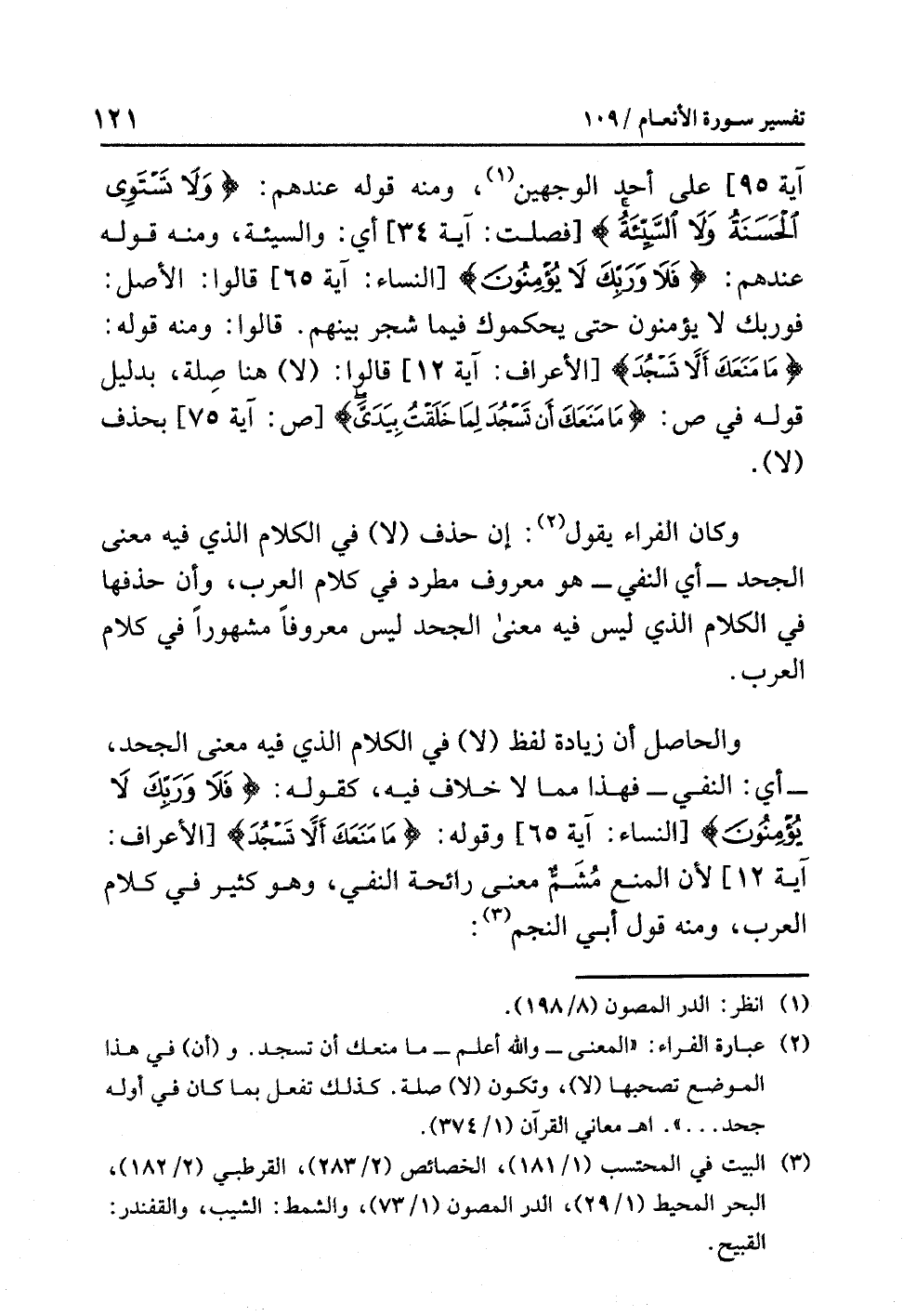 والحاصلُ أن زيادةَ لفظِ (لا) في الكلامِ الذي فيه معنَى الجحدِ، - أي: النفي - فهذا مِمَّا لاَ خلافَ فيه، كقولِه: {فَلاَ وَرَبِّكَ لاَ يُؤْمِنُونَ} [النساء: آية 65] وقوله: {مَا مَنَعَكَ أَلاَّ تَسْجُدَ إِذْ أَمَرْتُكَ} [الأعراف: آية 12] لأن المنعَ مُشَمٌّ معنَى رائحةِ النفيِ، وهو كثيرٌ في كلامِ العربِ، ومنه قولُ أَبِي النَّجْمِ (¬3):