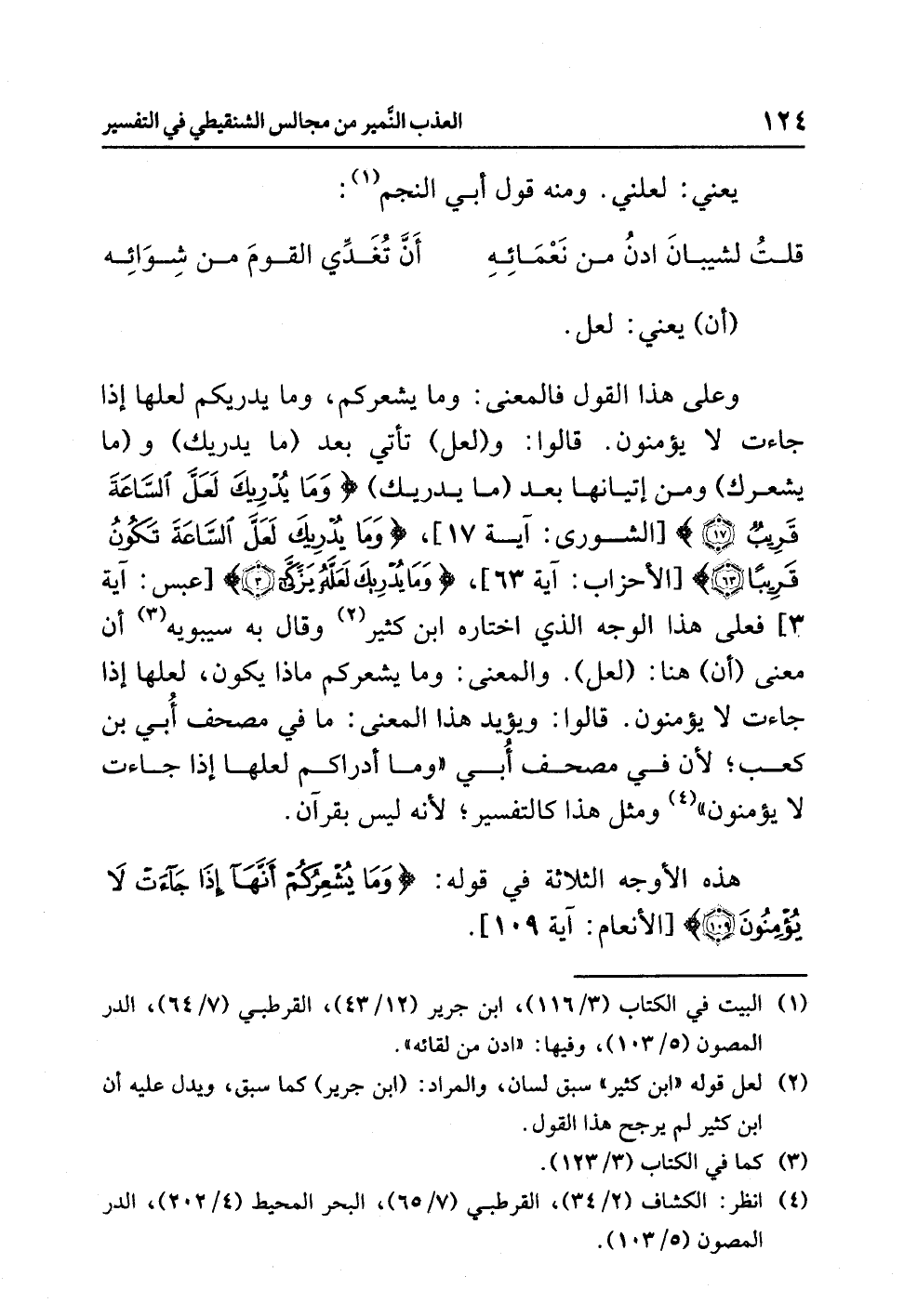 وعلى هذا القولِ فالمعنَى: وما يشعرُكم، وما يدريكم لَعَلَّهَا إذا جاءت لاَ يؤمنونَ. قالوا: و (لعل) تأتِي بعدَ (ما يدريك) و (ما يشعرك) وَمِنْ إِتْيَانِهَا بعدَ (ما يدريك) {وَمَا يُدْرِيكَ لَعَلَّ السَّاعَةَ قَرِيبٌ (17)} [الشورى: آية 17] {وَمَا يُدْرِيكَ لَعَلَّ السَّاعَةَ تَكُونُ قَرِيبًا (63)} [الأحزاب: آية 63] {وَمَا يُدْرِيكَ لَعَلَّهُ يَزَّكَّى (3)} [عبس: آية 3] فعلَى هذا الوجهِ الذي اختارَه ابنُ كثيرٍ (¬2) وقال به سيبويه (¬3) أن معنَى (أَنَّ) هُنَا: (لَعَلَّ). والمعنَى: وما يشعرُكم ماذا يكونُ، لَعَلَّهَا إذا جاءت لا يؤمنونَ. قالوا: ويؤيدُ هذا المعنَى: ما في مصحفِ أُبَيِّ بْنِ كَعْبٍ؛ لأن في مصحفِ أُبَيٍّ «وَمَا أَدْرَاكُمْ لَعَلَّهَا إذا جاءت لا يؤمنونَ» (¬4) ومثلُ هذا كالتفسيرِ؛ لأنه ليس بِقُرْآنٍ.