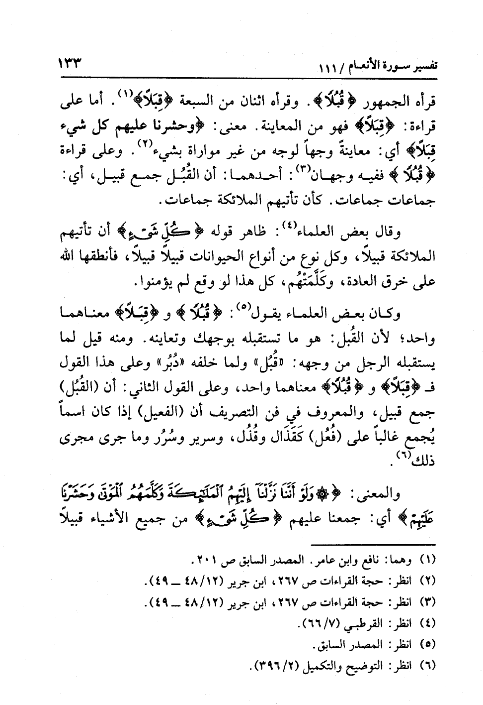 قَرَأَهُ الجمهورُ {قُبُلاً}. وقرأَه اثنانِ من السبعةِ {قِبَلاً} (¬1). أما على قراءةِ: {قِبَلاً} فهو مِنَ الْمُعَايَنَةِ. معنَى: {وحشرنا عليهم كل شيء قِبَلاً} أي: معاينةً وجهًا لِوَجْهٍ من غيرِ مواراةٍ بِشَيْءٍ (¬2). وعلى قراءةِ {قُبُلاً} ففيهِ وَجْهَانِ (¬3): أحدُهما: أن القُبُلَ جمعُ قبيل، أي: جماعات جماعات. كَأَنْ تَأْتِيَهُمُ الملائكةُ جماعاتٍ.