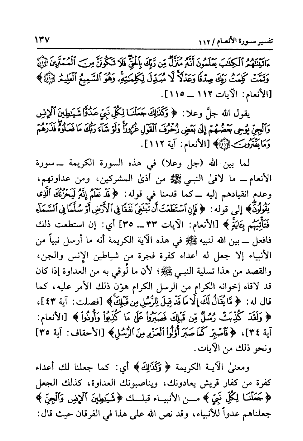 لَمَّا بَيَّنَ اللَّهُ (جل وعلا) في هذه السورةِ الكريمةِ - سورةِ الأنعامِ - ما لاَقَى النبيُّ - صلى الله عليه وسلم - من أذَى المشركين ومن عداوتِهم وعدمِ انقيادِهم إليه - كما قَدَّمْنَا في قولِه: {قَدْ نَعْلَمُ إِنَّهُ لَيَحْزُنُكَ الَّذِي يَقُولُونَ} إلى قولِه: {فَإِنِ اسْتَطَعْتَ أَنْ تَبْتَغِيَ نَفَقًا فِي الأَرْضِ أَوْ سُلَّمًا فِي السَّمَاءِ فَتَأْتِيَهُمْ بِآيَةٍ} [الأنعام: الآيات 33 - 35] أي: إن استعطتَ ذلك فَافْعَلْ - بَيَّنَ اللَّهُ لِنَبِيِّهِ - صلى الله عليه وسلم - في هذه الآيةِ الكريمةِ أنه ما أرسلَ نَبِيًّا من الأنبياءِ إلا جَعَلَ له أعداءً كفرةً فجرةً من شياطينِ الإنسِ والجنِّ، والقصدُ من هذا تسليةُ النبيِّ - صلى الله عليه وسلم -؛ لأن ما لُوقِيَ به من العداوةِ إذا كان قد لاَقَاهُ إخوانُه الكرامُ من الرسلِ الكرامِ هوَّن ذلك الأمر عليه، كما قال له: {مَا يُقَالُ لَكَ إِلاَّ مَا قَدْ قِيلَ لِلرُّسُلِ مِنْ قَبْلِكَ} [فصلت: آية 43] {وَلَقَدْ كُذِّبَتْ رُسُلٌ مِّنْ قَبْلِكَ فَصَبَرُوا عَلَى مَا كُذِّبُوا وَأُوذُوا} [الأنعام: آية 34] {فَاصْبِرْ كَمَا صَبَرَ أُولُوا الْعَزْمِ مِنَ الرُّسُلِ} [الأحقاف: آية 35] ونحو ذلك من الآياتِ.