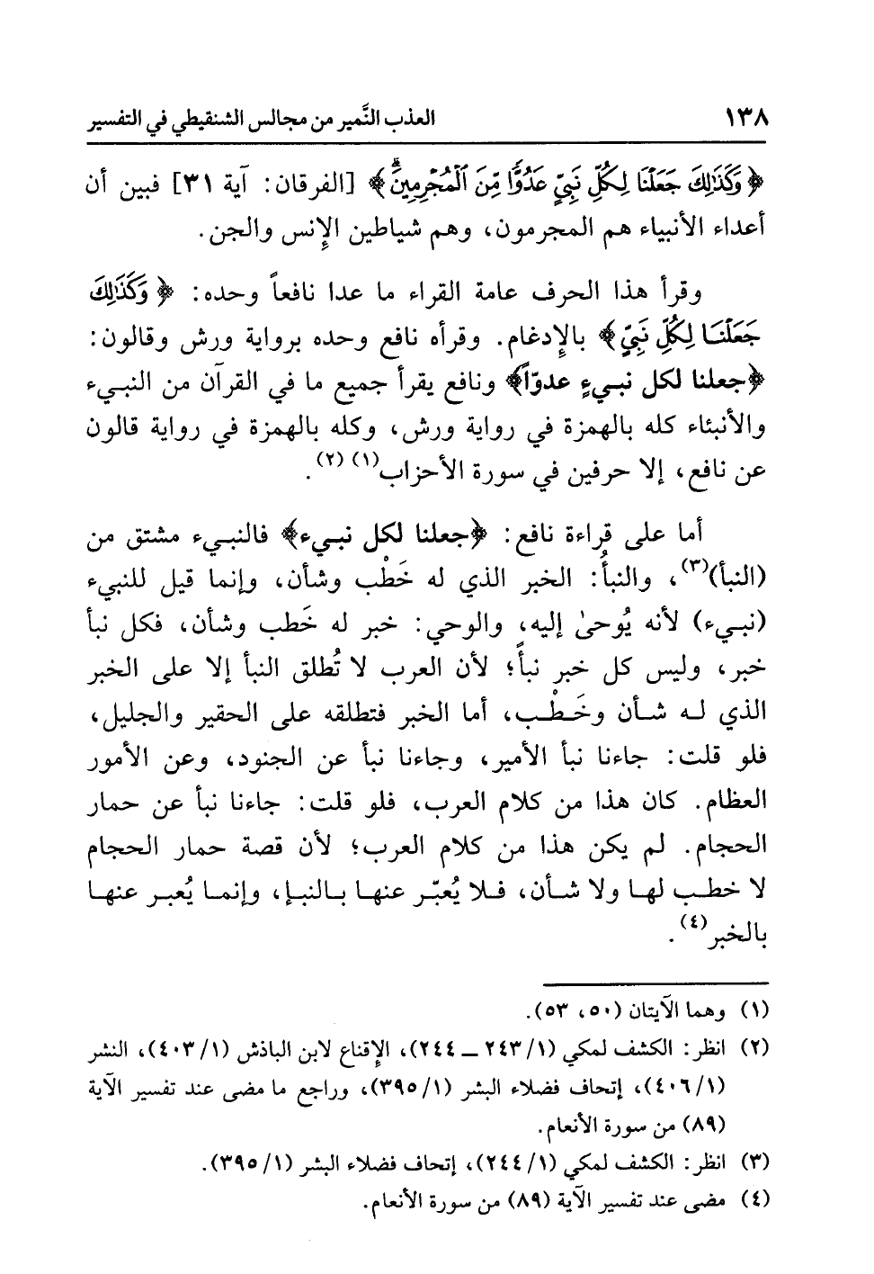 وقرأ هذا الحرفَ عامةُ القراءِ ما عَدَا نَافِعًا وحدَه: {وَكَذَلِكَ جَعَلْنَا لِكُلِّ نَبِيٍّ} بالإدغامِ. وقرأه نافعٌ وحدَه بروايةِ ورشٍ وقالونَ: {جعلنا لكل نبيءٍ عدوًّا} ونافعٌ يقرأُ جميعَ ما في القرآنِ من النبيءِ والأنبئاءِ كُلَّهُ بالهمزةِ في روايةِ ورشٍ، وكله بالهمزةِ في روايةِ قالونَ عن نافعٍ، إلا حَرْفَيْنِ في سورةِ الأحزابِ (¬1) (¬2).