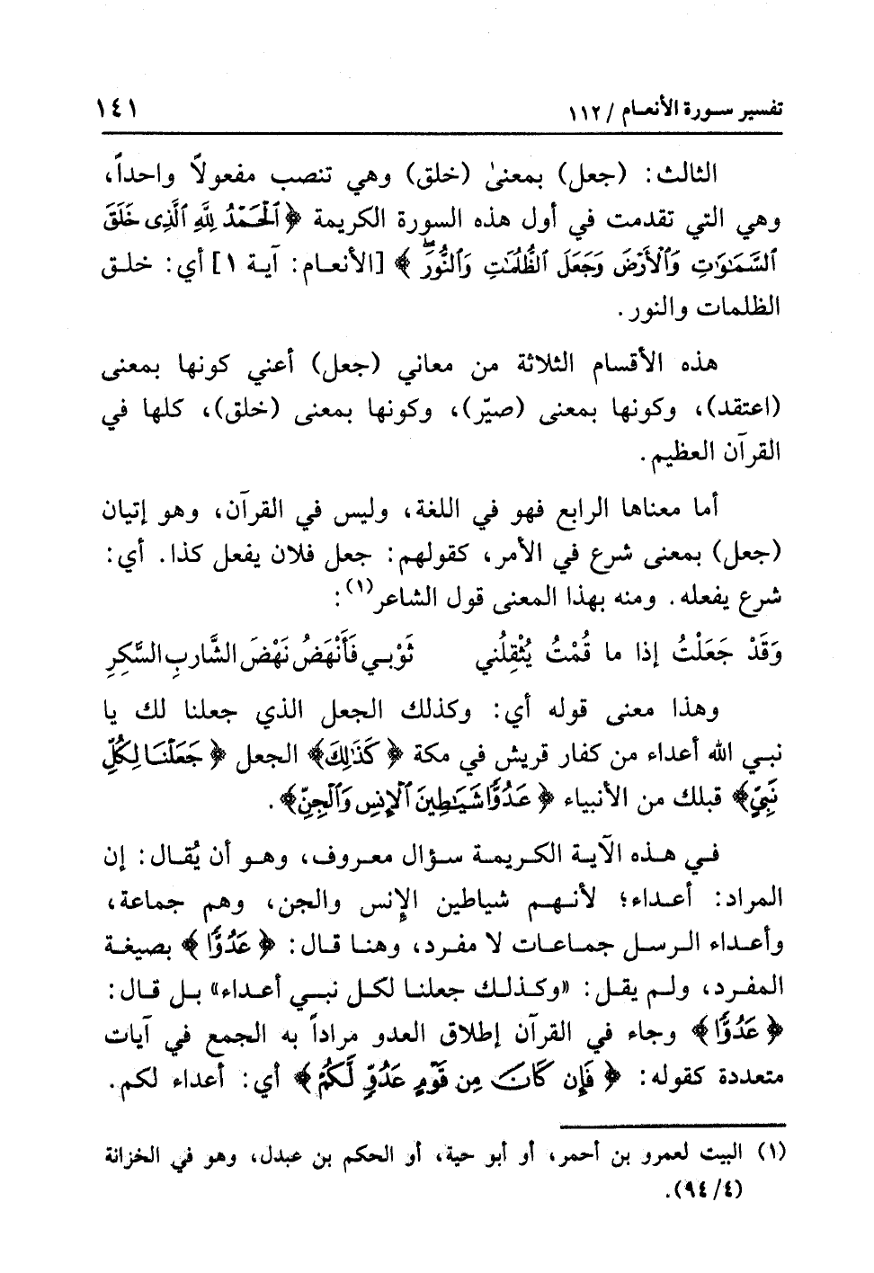 في هذه الآيةِ الكريمةِ سؤالٌ معروفٌ، وهو أن يُقالَ: إن المرادَ: أعداءٌ؛ لأنهم شياطينُ الإنسِ والجنِّ، وهم جماعةٌ، وأعداءُ الرسلِ جماعاتٌ لاَ مفردٌ، وهنا قال: {عَدُوًّا} بصيغةِ المفردِ، ولم يَقُلْ: «وكذلك جعلنا لكل نبي أعداءً» بل قال: {عَدُوًّا} وجاءَ في القرآنِ إطلاقُ العدوِّ مُرَادًا به الجمعُ في آياتٍ متعددةٍ كقولِه: {فَإِنْ كَانَ مِنْ قَوْمٍ عَدُوٍّ لَّكُمْ} أي: أعداءٌ لكم.