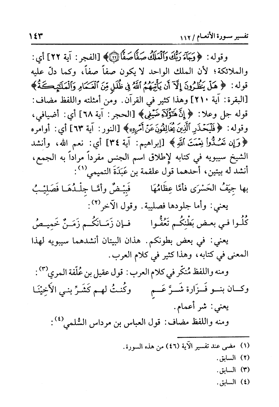 وقولُه: {وَجَاءَ رَبُّكَ وَالْمَلَكُ صَفًّا صَفًّا (22)} [الفجر: آية 22] أي: والملائكةُ؛ لأن الملكَ الواحدَ لاَ يكونُ صَفًّا صَفًّا، وكما دَلَّ عليه قولُه: {هَلْ يَنْظُرُونَ إِلاَّ أَنْ يَأْتِيَهُمُ اللَّهُ فِي ظُلَلٍ مِّنَ الْغَمَامِ وَالْمَلائِكَةُ} [البقرة: آية 210] وهذا كثيرٌ في القرآنِ. ومن أمثلتِه واللفظُ مضافٌ: قولُه جل وعلا: {إِنَّ هَؤُلاَءِ ضَيْفِي} [الحجر: آية 68]، أي: أَضْيَافِي، وقولُه: {فَلْيَحْذَرِ الَّذِينَ يُخَالِفُونَ عَنْ أَمْرِهِ} [النور: آية 63] أي: أَوَامِرِهِ {وَإِنْ تَعُدُّوا نِعْمَتَ اللَّهِ لاَ تُحْصُوهَا} [إبراهيم: آية 34] أي: نِعَمَ اللَّهِ، وأنشدَ الشيخُ سيبويه في كتابِه لإطلاقِ اسمِ الجنسِ مُفْرَدًا مُرَادًا به الجمعُ، أنشدَ له بيتين، أحدُهما قولُ علقمةَ بنِ عَبَدَةَ التميميِّ (¬1):