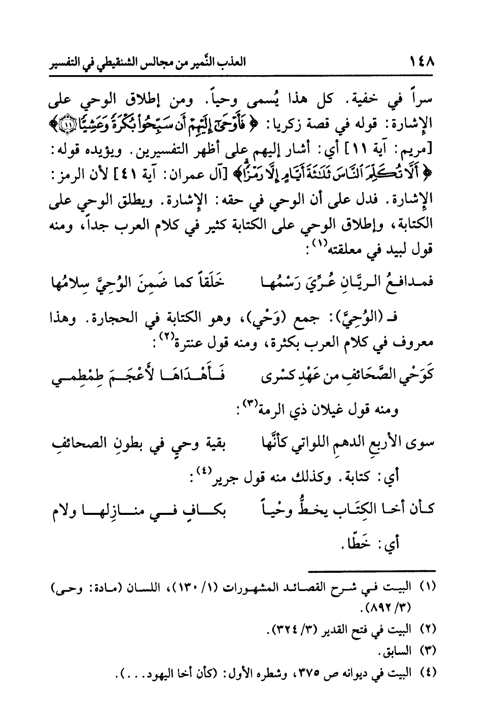 سِرًّا في خفية. كل هذا يُسَمَّى وحيًا. ومن إطلاقِ الوحيِ على الإشارةِ قولُه في قصةِ زكريا: {فَأَوْحَى إِلَيْهِمْ أَنْ سَبِّحُوا بُكْرَةً وَعَشِيًّا (11)} [مريم: آية 11] أي: أشارَ إليهم على أظهرِ التَّفْسِيرَيْنِ. ويؤيدُه قولُه: {أَلاَّ تُكَلِّمَ النَّاسَ ثَلاَثَةَ أَيَّامٍ إِلاَّ رَمْزًا} [آل عمران: آية 41] لأَنَّ الرمز: الإشارةُ. فدلَّ على أن الوحيَ في حَقِّهِ: الإشارةُ. وَيُطْلَقُ الوحيُ على الكتابةِ، وإطلاقُ الوحيِ على الكتابةِ كثيرٌ في كلامِ العربِ جِدًّا، ومنه قولُ لبيدٍ في معلقتِه (¬1):