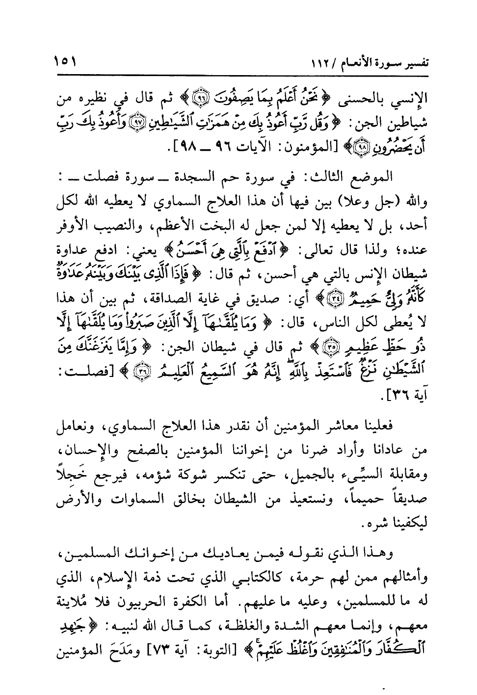 فعلينا معاشرَ المؤمنين أن نقدرَ هذا العلاجَ السماويَّ، ونعاملَ مَنْ عَادَانَا وأرادَ ضُرَّنَا من إخوانِنا المؤمنين بالصفحِ والإحسانِ، ومقابلةِ السَّيِّئِ بالجميلِ، حتى تنكسرَ شوكةُ شُؤْمِهِ، فيرجع خَجِلاً صديقًا حميمًا، ونستعيذُ من الشيطانِ بخالقِ السماواتِ والأرضِ لِيَكْفِيَنَا شَرَّهُ.