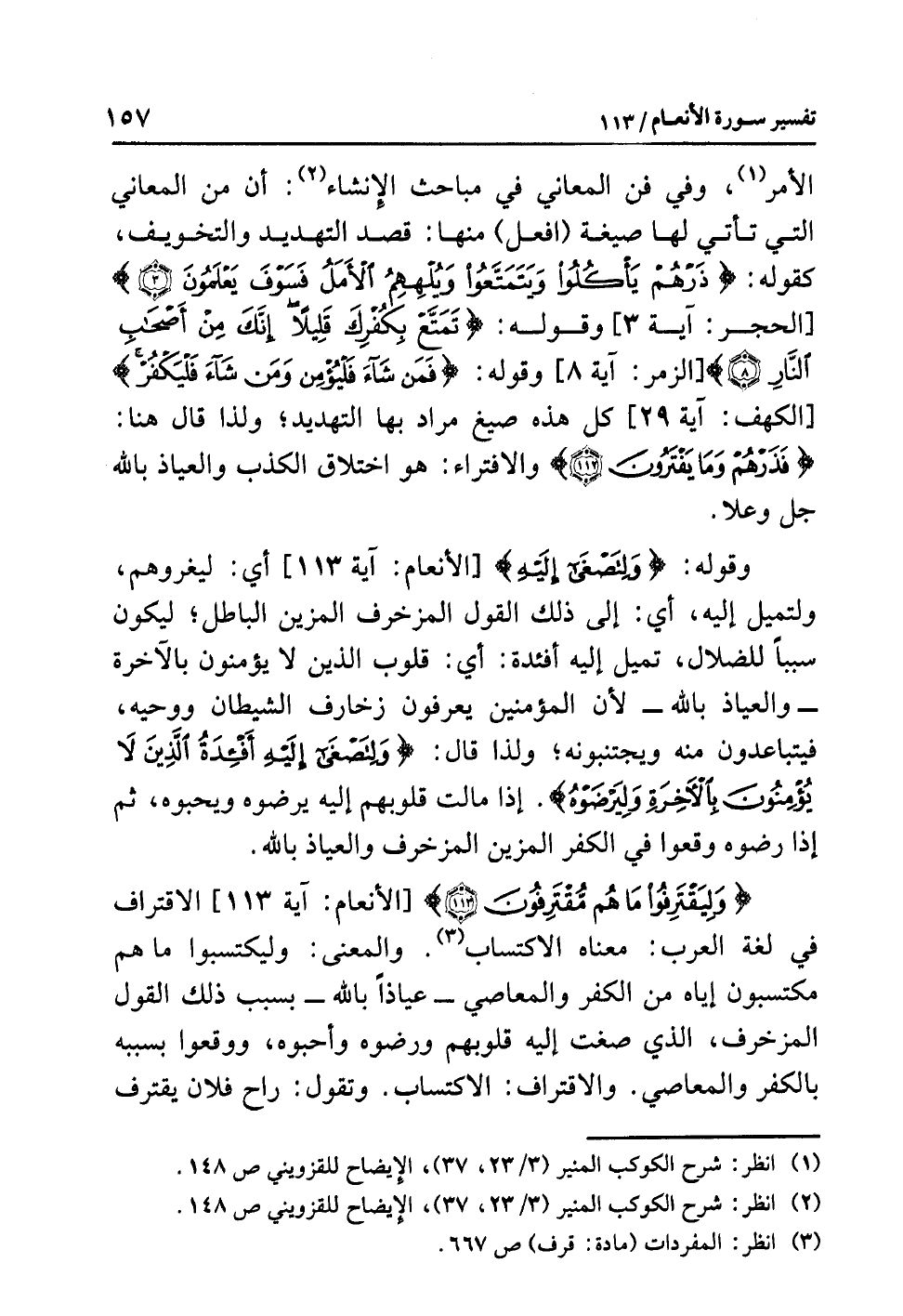 {وَلِيَقْتَرِفُوا مَا هُم مُّقْتَرِفُونَ (113)} [الأنعام: آية 113] الاقترافُ في لغةِ العربِ: معناه الاكتسابُ (¬3). والمعنَى: وَلِيَكْتَسِبُوا ما هم مكتسبونَ إياه من الكفرِ والمعاصِي - عياذًا بالله - بسببِ ذلك القولِ المزخرفِ، الذي صَغَتْ إليه قلوبُهم ورضوه وأحبوه، ووقعوا بسببِه بالكفرِ والمعاصِي. والاقترافُ: الاكتسابُ. وتقول: راحَ فلانٌ يقترفُ