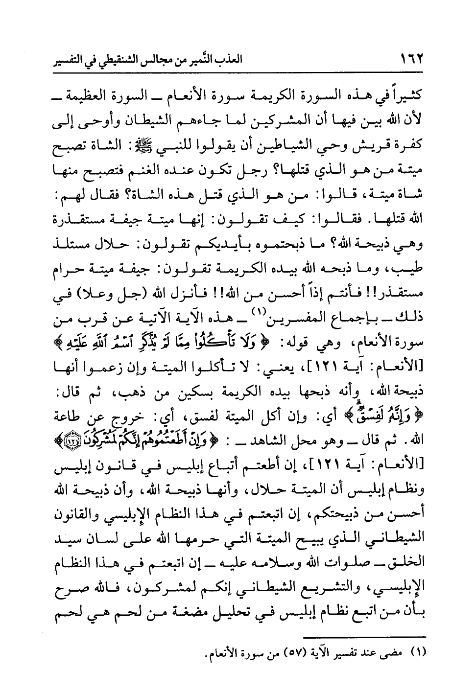 كثيرًا في هذه السورةِ الكريمةِ؛ سورةِ الأنعامِ - السورةِ العظيمةِ - لأن اللَّهَ بَيَّنَ فيها أن المشركين لَمَّا جاءهم الشيطانُ وأوحى إلى كفرةِ قريشٍ وحيَ الشياطين أن يقولوا للنبيِّ - صلى الله عليه وسلم -: الشاةُ تُصْبِحُ ميتةً مَنْ هو الذي قَتَلَهَا؟ رجلٌ تكون عندَه الغنمُ فتصبحُ منها شاةٌ ميتةٌ، قالوا: مَنْ هو الذي قَتَلَ هذه الشاةَ؟ فقال لهم: اللَّهُ قَتَلَهَا. فقالوا: كيف تقولونَ: إنها ميتةٌ جيفةٌ مستقذرةٌ وهي ذبيحةُ اللَّهِ؟ ما ذَبَحْتُمُوهُ بأيديكم تقولونَ: حلالٌ مستلذٌّ طيبٌ، وما ذَبَحَهُ اللَّهُ بيدِه الكريمةِ تقولونَ: جيفةٌ ميتةٌ حرامٌ مستقذر!! فأنتم إذًا أحسنُ مِنَ اللَّهِ!! فأنزلَ اللَّهُ (جل وعلا) في ذلك - بإجماعِ المفسرين (¬1)