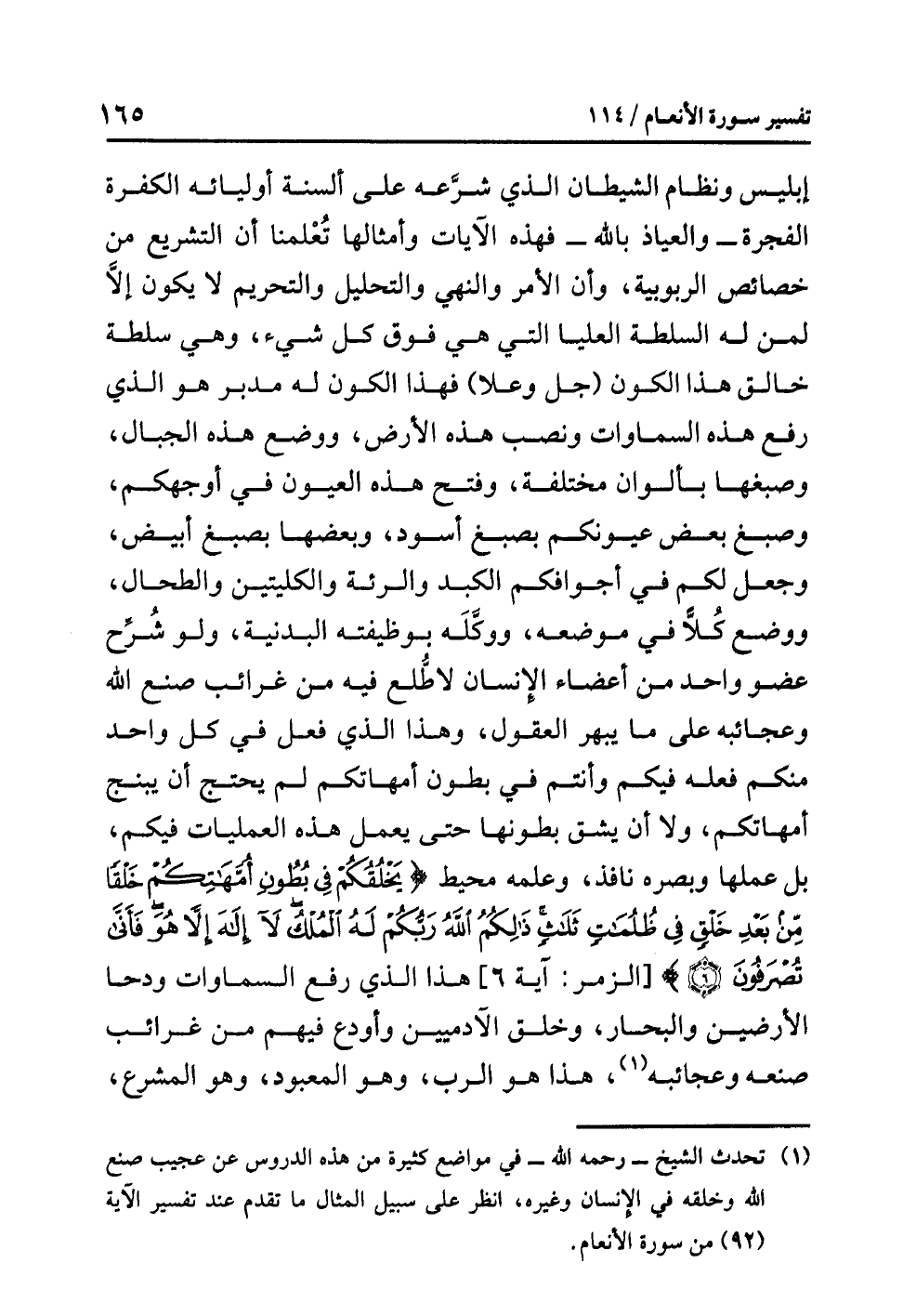 إبليسَ ونظامَ الشيطانِ الذي شَرَّعَهُ على ألسنةِ أوليائِه الكفرةِ الفجرةِ - والعياذُ بالله - فهذهُ الآياتُ وأمثالُها تُعْلِمُنَا أن التشريعَ من خصائصِ الربوبيةِ، وأن الأمرَ والنهيَ والتحليلَ والتحريمَ لا يكونُ إلاَّ لمن له السلطةُ العليا التي هي فوقَ كُلِّ شَيْء، وهي سلطةُ خالقِ هذا الكونِ (جل وعلا) فهذا الكونُ له مُدَبِّرٌ هو الذي رفعَ هذه السماواتِ وَنَصَبَ هذه الأرضَ، ووضعَ هذه الجبالَ، وَصَبَغَهَا بألوانٍ مختلفةٍ، وفتحَ هذه العيونَ في أوجهكم، وصبغَ بعضَ عيونِكم بصبغٍ أسودَ، وبعضَها بصبغٍ أبيضَ، وجعل لكم في أجوافِكم الكبدَ والرئةَ وَالْكُلْيَتَيْنِ والطحالَ، ووضعَ كُلاًّ في موضِعه، ووكَّلَه بوظيفتِه البدنيةِ، ولو شُرِّحَ عضوٌ واحدٌ من أعضاءِ الإنسانِ لاطُّلع في من غرائبِ صنعِ اللَّهِ وعجائبِه على ما يُبْهِرُ العقولَ، وهذا الذي فَعَلَ في كُلِّ واحدٍ مِنْكُمْ فِعْلَهُ فيكم وأنتم في بطونِ أمهاتِكم لم يَحْتَجْ أن يُبَنِّجَ أمهاتِكم، ولا أن يشقَ بطونَها حتى يعملَ هذه العملياتِ فيكم، بل عملها وَبَصَرُهُ نافذٌ، وعلمُه محيطٌ: {يَخْلُقُكُمْ فِي بُطُونِ أُمَّهَاتِكُمْ خَلْقًا مِّنْ بَعْدِ خَلْقٍ فِي ظُلُمَاتٍ ثَلاثٍ ذلِكُمُ اللَّهُ رَبُّكُمْ لَهُ الْمُلْكُ لا إِلَهَ إِلاَّ هُوَ فَأَنَّى تُصْرَفُونَ} [الزمر: آية 6]