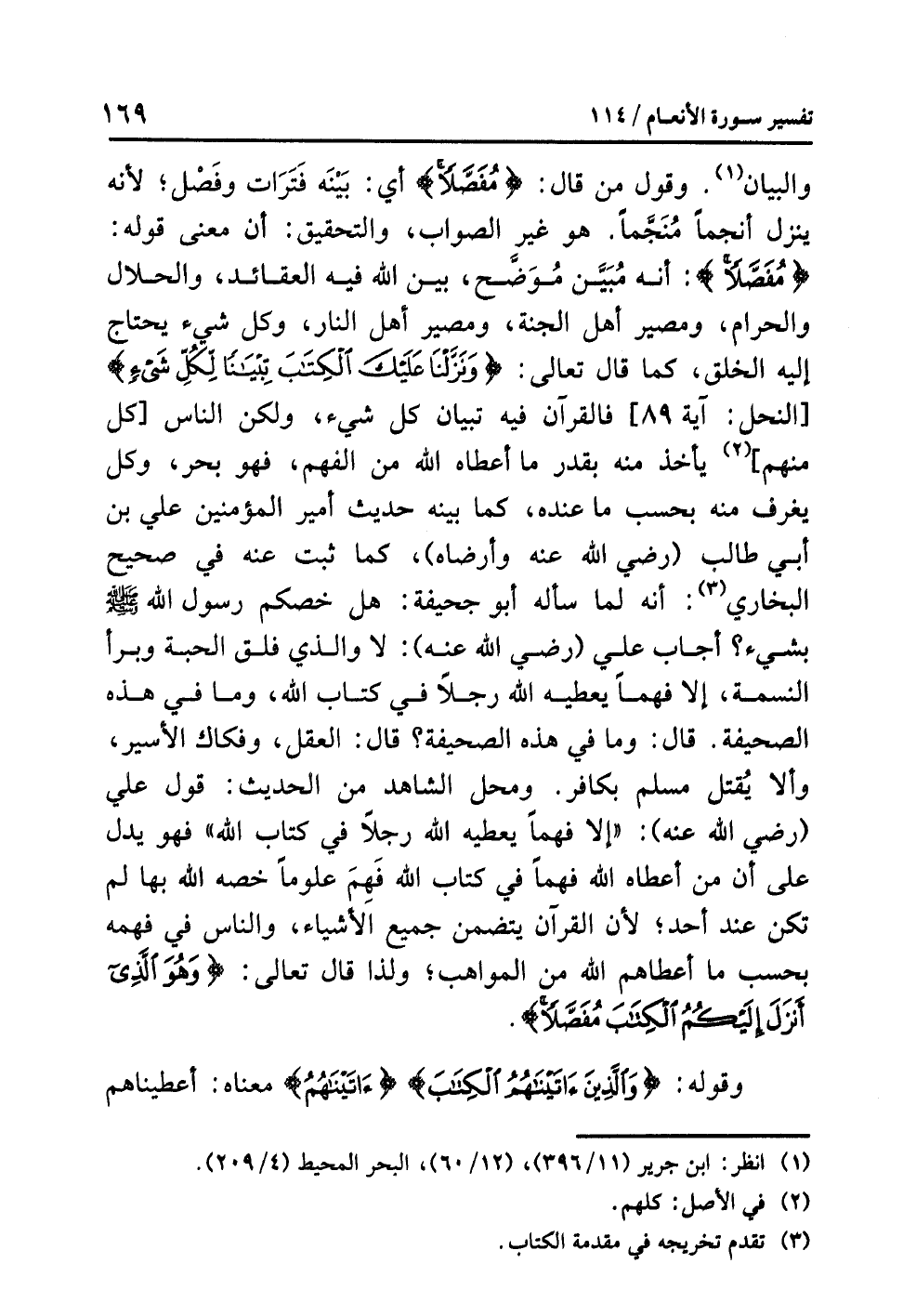 والبيانُ (¬1). وقولُ مَنْ قال: «{مُفَصَّلاً} أي: بَيْنَهُ فَتَرَاتٌ وفَصْلٌ؛ لأنه يُنَزَّلُ أَنْجُمًا مُنَجَّمًا. هو غيرُ الصوابِ، والتحقيقُ: أن معنَى قولِه: {مُفَصَّلاً}: أنه مُبَيَّنٌ مُوَضَّحٌ، بَيَّنَ اللَّهُ فيه العقائدَ والحلالَ والحرامَ، ومصيرَ أهلِ الجنةِ، ومصيرَ أهلِ النارِ، وَكُلَّ شيءٍ يحتاجُ إليه الخلقُ، كما قال تعالى: {وَنَزَّلْنَا عَلَيْكَ الْكِتَابَ تِبْيَانًا لِّكُلِّ شَيْءٍ} [النحل: آية 89] فالقرآنُ فيه تبيانُ كُلِّ شيءٍ، وَلَكِنَّ الناسَ [كل منهم] (¬2) يأخذ منه بِقَدْرِ ما أعطاه اللَّهُ من الفهمِ، فهو بَحْرٌ، وَكُلٌّ يَغْرِفُ منه بِحَسَبِ ما عندَه، كما بَيَّنَهُ حديثُ أميرِ المؤمنين عَلِيِّ بنِ أبِي طالبٍ (رضي الله عنه وأرضاه)، كما ثَبَتَ عنه في صحيحِ البخاريِّ (¬3): أنه لَمَّا سَأَلَهُ أبو جحيفةَ: هَلْ خَصَّكُمْ رسولُ اللَّهِ - صلى الله عليه وسلم - بشيءٍ؟ أجاب عَلِيٌّ (رضي الله عنه): لاَ والذي فَلَقَ الحبةَ وبرأَ النسمةَ، إلا فَهْمًا يُعْطِيهِ اللَّهُ رجلاً في كتابِ الله، وما في هذه الصحيفةِ. قال: وما في هذه الصحيفةِ؟ قال: العقلُ وفكاكُ الأسيرِ، وَأَلاَّ يُقْتَلَ مسلمٌ بكافرٍ. ومحلُّ الشاهدِ من الحديثِ: قولُ عَلِيٍّ (رضي الله عنه): «إِلاَّ فَهْمًا يُعْطِيهِ اللَّهُ رجلاً في كتابِ اللَّهِ» فهو يدلُّ على أن مَنْ أَعْطَاهُ اللَّهُ فَهْمًا في كتابِ اللَّهِ فَهِمَ علومًا خَصَّهُ اللَّهُ بها لم تكن عن أحدٍ؛ لأن القرآنَ يتضمنُ جميعَ الأشياءِ، والناسُ في فَهْمِهِ بحسبِ ما أعطاهم اللَّهُ من المواهبِ؛ ولذا قال تعالى: {وَهُوَ الَّذِي أَنْزَلَ إِلَيْكُمُ الْكِتَابَ مُفَصَّلاً}.