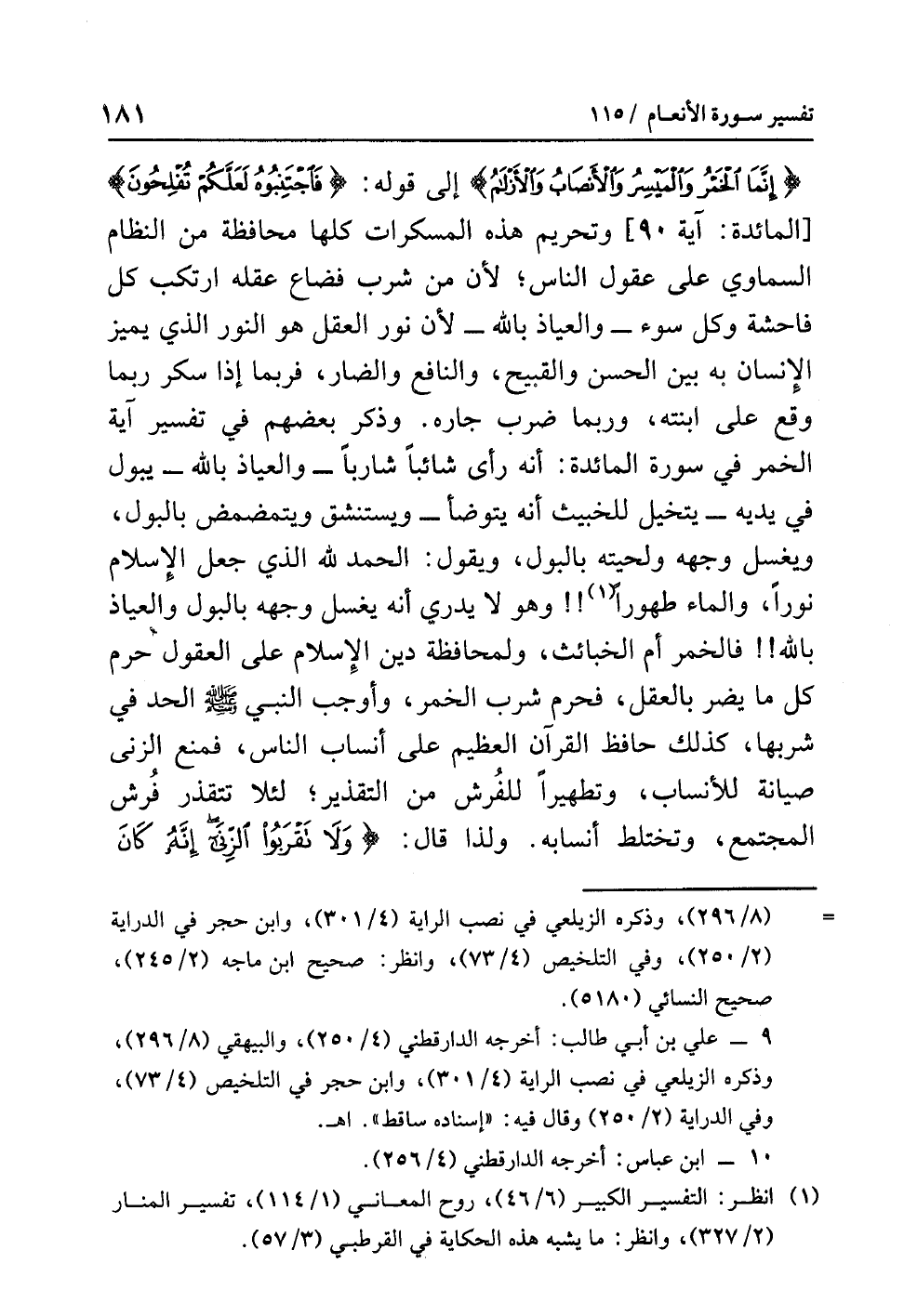 وَذَكَرَ بعضُهم في تفسيرِ آيةِ الخمرِ في سورةِ المائدةِ: أنه رَأَى شَائبًا شَارِبًا - والعياذُ بالله - يبولُ في يَدَيْهِ - يتخيلُ للخبيثِ أنه يَتَوَضَّأُ - ويستنشقُ ويتمضمضُ بالبولِ، ويغسلُ وجهَه ولحيتَه بالبولِ، ويقولُ: الحمدُ لله الذي جعلَ الإسلامَ نُورًا، والماءَ طَهُورًا (¬1)!! وهو لا يَدْرِي أنه يغسلُ وجهَه بالبولِ والعياذُ بالله!! فالخمرُ أُمُّ الخبائثِ، ولمحافظةِ دينِ الإسلامِ على العقولِ حَرَّمَ كُلَّ ما يضرُّ بالعقلِ، فَحَرَّمَ شربَ الخمرِ، وأوجبَ النبيُّ - صلى الله عليه وسلم - الحدَّ في شربِها، كذلك حافظَ القرآنُ العظيمُ على أنسابِ الناسِ، فَمَنَعَ الزِّنَى صيانةً للأنسابِ، وَتَطْهِيرًا لِلْفُرُشِ من التقذيرِ؛ لئلاَّ تتقذرَ فُرُشُ المجتمعِ، وتختلطَ أنسابُه؛ ولذا قال: {وَلاَ تَقْرَبُوا الزِّنَى إِنَّهُ كَانَ