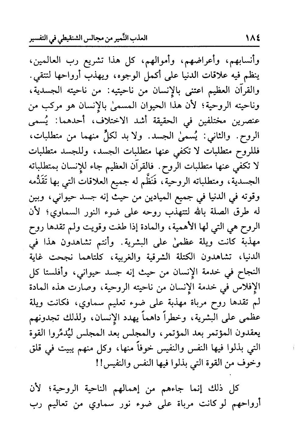 والثاني: يُسَمَّى الجسدَ. ولابدَّ لكلٍّ منهما من متطلباتٍ، فللروحِ متطلباتٌ لاَ تكفي عنها متطلباتُ الجسدِ، وللجسدِ متطلباتٌ لا تكفي عنها متطلباتُ الروحِ. فالقرآنُ العظيمُ جاء للإنسانِ بمتطلباتِه الجسديةِ، ومتطلباتِه الروحيةِ، فَنَظَّمَ له جميعَ العلاقاتِ التي بها تَقَدُّمُهُ وقوتُه في الدنيا في جميعِ الميادينِ من حيثُ إنه جسدٌ حَيَوَانِيٌّ، وَبَيَّنَ له طرقَ الصلةِ بالله لتتهذبَ روحُه على ضوءِ النورِ السماويِّ؛ لأن الروحَ هي التي لها الأهميةُ، والمادةُ إذا طَغَتْ وَقَوِيَتْ وَلَمْ تقدها روحٌ مهذبةٌ كانت ويلةً عُظْمَى على البشريةِ.