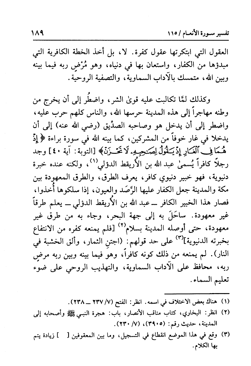 وكذلك لَمَّا تَكَالَبَتْ عليه قُوَى الشَّرِّ، وَاضْطُرَّ إلى أن يخرجَ من وطنِه مُهَاجِرًا إلى هذه المدينةِ حَرَسَهَا اللَّهُ، والناسُ كُلُّهُمْ حربٌ عليه، واضطر إلى أن يدخلَ هو وصاحبُه الصِّدِّيقُ (رضي الله عنه) إلى أن يدخلاَ في غَارٍ خَوْفًا من المشركين، كما بينه اللَّهُ في سورةِ براءةِ: {إِذْ هُمَا فِي الْغَارِ إِذْ يَقُولُ لِصَاحِبِهِ لاَ تَحْزَنْ} [التوبة: آية 40] وَجَدَ رجلاً كافرًا يُسَمَّى عبدَ اللَّهِ بنَ الأُريقط الدؤلي (¬1)، ولكنه عندَه خبرةٌ دنيويةٌ، فهو خبيرٌ دنيويٌّ كافرٌ، يعرفُ الطرقَ، والطرقُ المعهودةُ بينَ مكةَ والمدينةِ جعلَ الكفارَ عليها الرَّصَدَ والعيونَ، إذا سَلَكُوهَا أخذوا، فصارَ هذا الخبيرُ الكافرُ- عبدُ اللَّهُ بنُ الأُريقط الدؤليُّ- يعلمُ طُرُقًا غيرَ معهودةٍ. سَاحَلَ به إلى جهةِ البحرِ، وجاء به من طرقٍ غيرِ معهودةٍ، حتى أَوْصَلَهُ المدينةَ بسلامٍ (¬2) [فلم يَمْنَعْهُ كفرُه من الانتفاعِ بخبرتِه الدنيويةِ] (¬3).