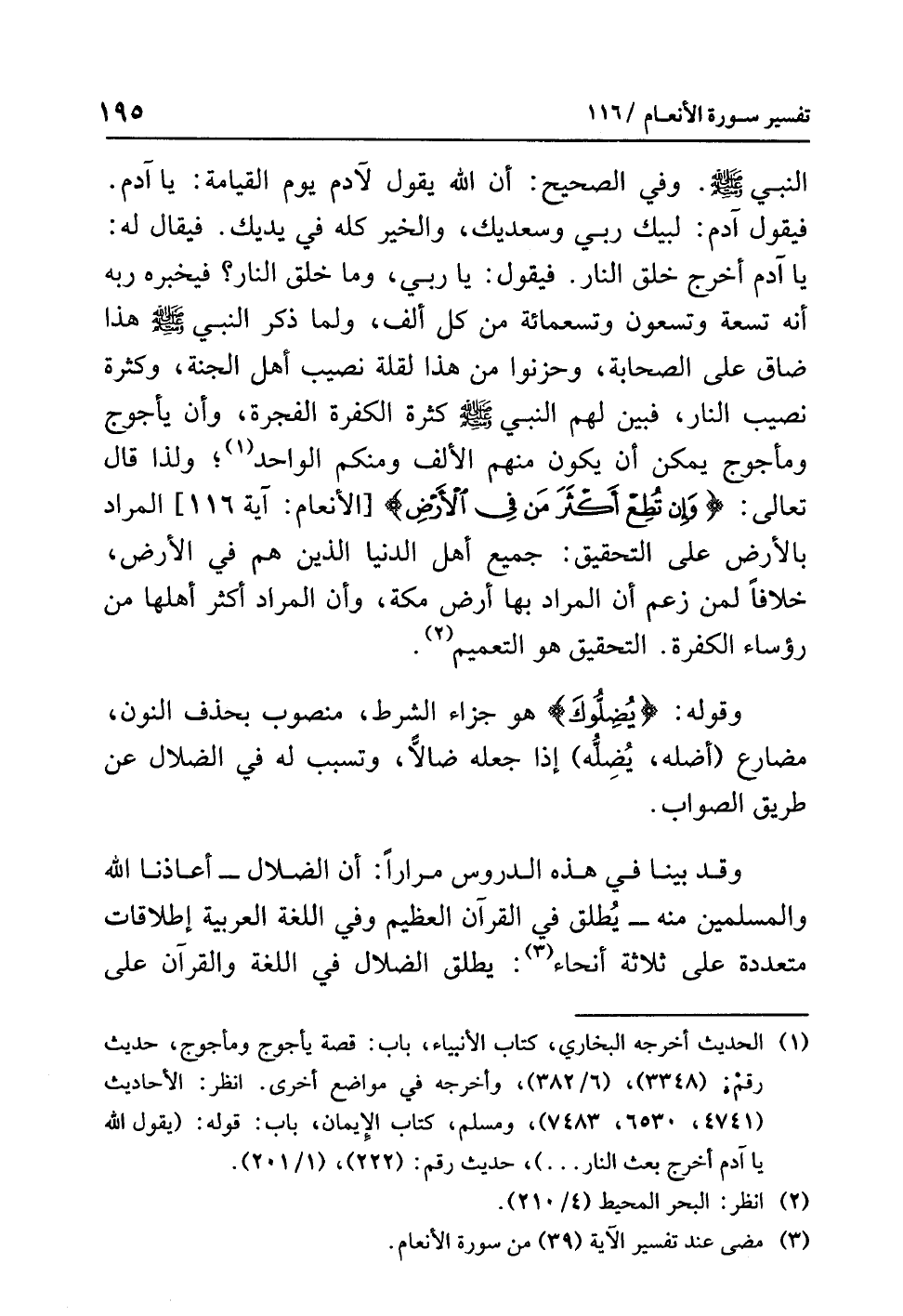ولذا قال تعالى: {وَإِنْ تُطِعْ أَكْثَرَ مَنْ فِي الأَرْضِ} [الأنعام: آية 116] المرادُ بالأرضِ على التحقيقِ: جميعُ أهلِ الدنيا الذين هُمْ في الأرضِ، خِلاَفًا لِمَنْ زَعَمَ أَنَّ المرادَ بها أرضُ مكةَ، وأن المرادَ أكثرُ أهلِها مِنْ رؤساءِ الكفرةِ. التحقيقُ هو التعميمُ (¬2).