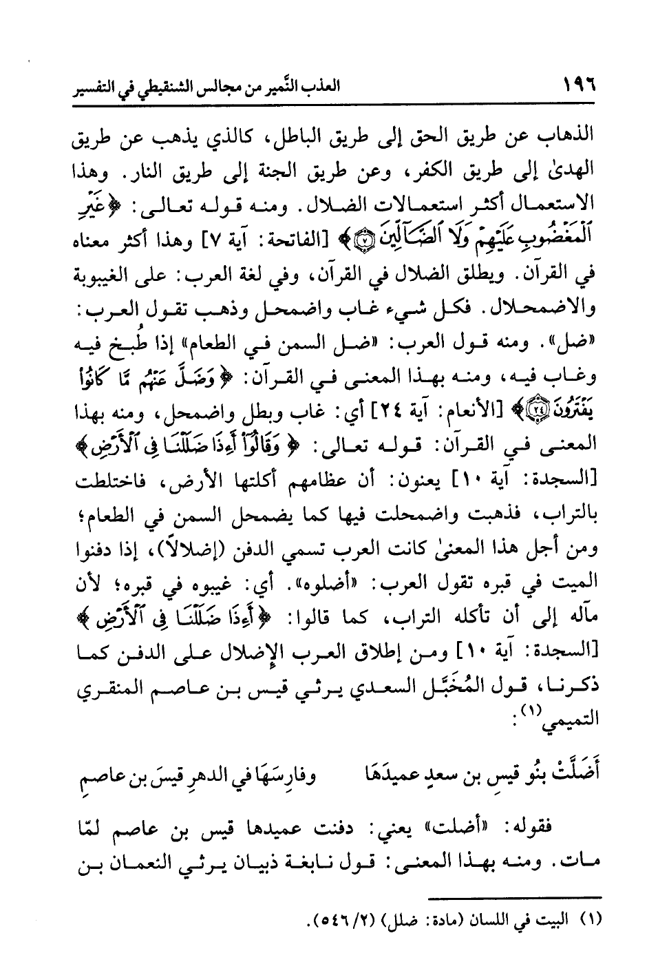 الذهابِ عن طريقِ الحقِّ إلى طريقِ الباطلِ، كالذي يذهبُ عن طريقِ الْهُدَى إلى طريقِ الكفرِ، وعن طريقِ الجنةِ إلى طريقِ النارِ. وهذا الاسْتِعْمَالُ أكثرُ استعمالاتِ الضلالِ. ومنه قولُه تعالى: {غَيْرِ الْمَغضُوبِ عَلَيهِمْ وَلاَ الضَّالِّينَ (7)} [الفاتحة: آية 7] وهذا أكثرُ معناه في القرآنِ. وَيُطْلَقُ الضلالُ في القرآنِ، وفي لغةِ العربِ: على الغيبوبةِ والاضمحلالِ. فَكُلُّ شيءٍ غَابَ وَاضْمَحَلَّ وذهبَ تقولُ العربُ: «ضَلَّ». ومنه قولُ العربِ: «ضَلَّ السَّمْنُ في الطعامِ» إذا طُبِخَ فيه وَغَابَ فيه، ومنه بهذا المعنَى في القرآنِ: {وَضَلَّ عَنْهُم مَّا كَانُوا يَفْتَرُونَ (24)} [الأنعام: آية 24] أي: غَابَ وَبَطَلَ وَاضْمَحَلَّ، ومنه بهذا المعنَى في القرآنِ: قولُه تعالى: {وَقَالُوا أَئِذَا ضَلَلْنَا فِي الْأَرْضِ} [السجدة: آية 10] يَعْنُونَ: أن عظامَهم أَكَلَتْهَا الأرضُ، فَاخْتَلَطَتْ بالترابِ، فَذَهَبَتْ وَاضْمَحَلَّتْ فيها كما يضمحلُ السمنُ في الطعامِ؛ وَمِنْ أجلِ هذا المعنَى كانت العربُ تُسَمِّي الدفنَ (إضلالاً)، إذا دَفَنُوا الميتَ في قبرِه تقولُ العربُ: «أَضَلُّوهُ». أي: غَيَّبُوهُ فِي قَبْرِهِ؛ لأن مآلَه إلى أن تَأْكُلَهُ الترابُ، كَمَا قالوا: {أَئِذَا ضَلَلْنَا فِي الْأَرْضِ} [السجدة: آية 10] ومن إطلاقِ العربِ الإضلالَ على الدفنِ كما ذَكَرْنَا قولُ المُخَبَّلِ السعديِّ يَرْثِي قيسَ بنَ عاصمٍ المنقريَّ التميميَّ (¬1):