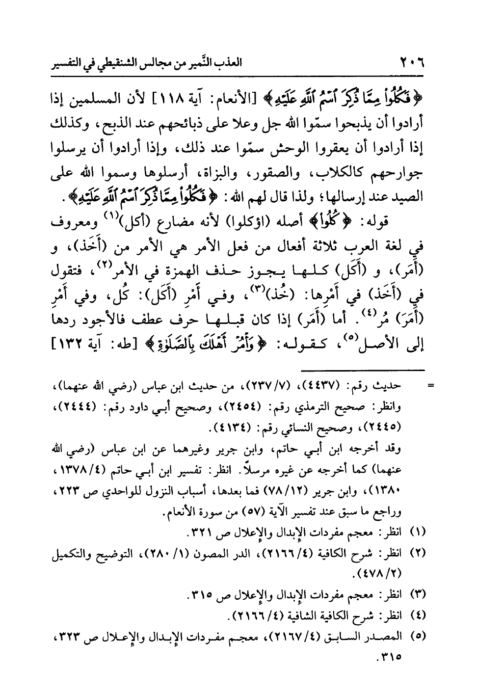 ومعروفٌ في لغةِ العربِ ثلاثةُ أفعالٍ من فعلِ الأمرِ هي الأمرُ من (أَخَذَ)، و (أَمَرَ)، و (أَكَلَ) كُلُّهَا يجوزُ حذفُ الهمزةِ في الأمرِ (¬2)، فتقولُ في (أَخَذَ) في أَمْرِهَا: (خُذْ) (¬3)، وفي أَمْرِ (أَكَلَ): كُلْ، وفي أَمْرِ (أَمَرَ) مُرْ (¬4). أما (أَمَرَ) إذا كان قَبْلَهَا حرفُ عطفٍ فالأجودُ رَدُّهَا إلى الأصلِ (¬5)، كقولِه: {وَأْمُرْ أَهْلَكَ بِالصَّلاَةِ} [طه: آية 132]