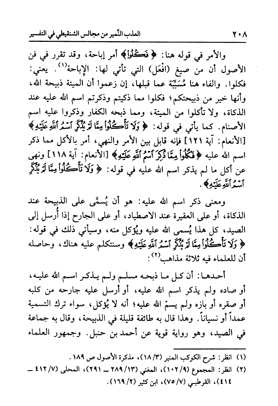 ومعنَى ذِكْرِ اسمِ اللَّهِ عليه: هو أَنْ يُسمَّى على الذبيحةِ عندَ الذكاةِ، أو على العقيرةِ عندَ الاصطيادِ، أو على الجارحِ إذا أُرْسِلَ إلى الصيدِ، كُلُّ هذا يُسَمَّى اللَّهُ عليه وَيُؤْكَلُ منه، وسيأتِي ذلك في قولِه: {وَلاَ تَأْكُلُوا مِمَّا لَمْ يُذْكَرِ اسْمُ اللَّهِ عَلَيْهِ} وَسَنَتَكَلَّمُ عليه هناكَ، وحاصلُه أن للعلماءِ فيه ثلاثةَ مذاهبَ (¬2):