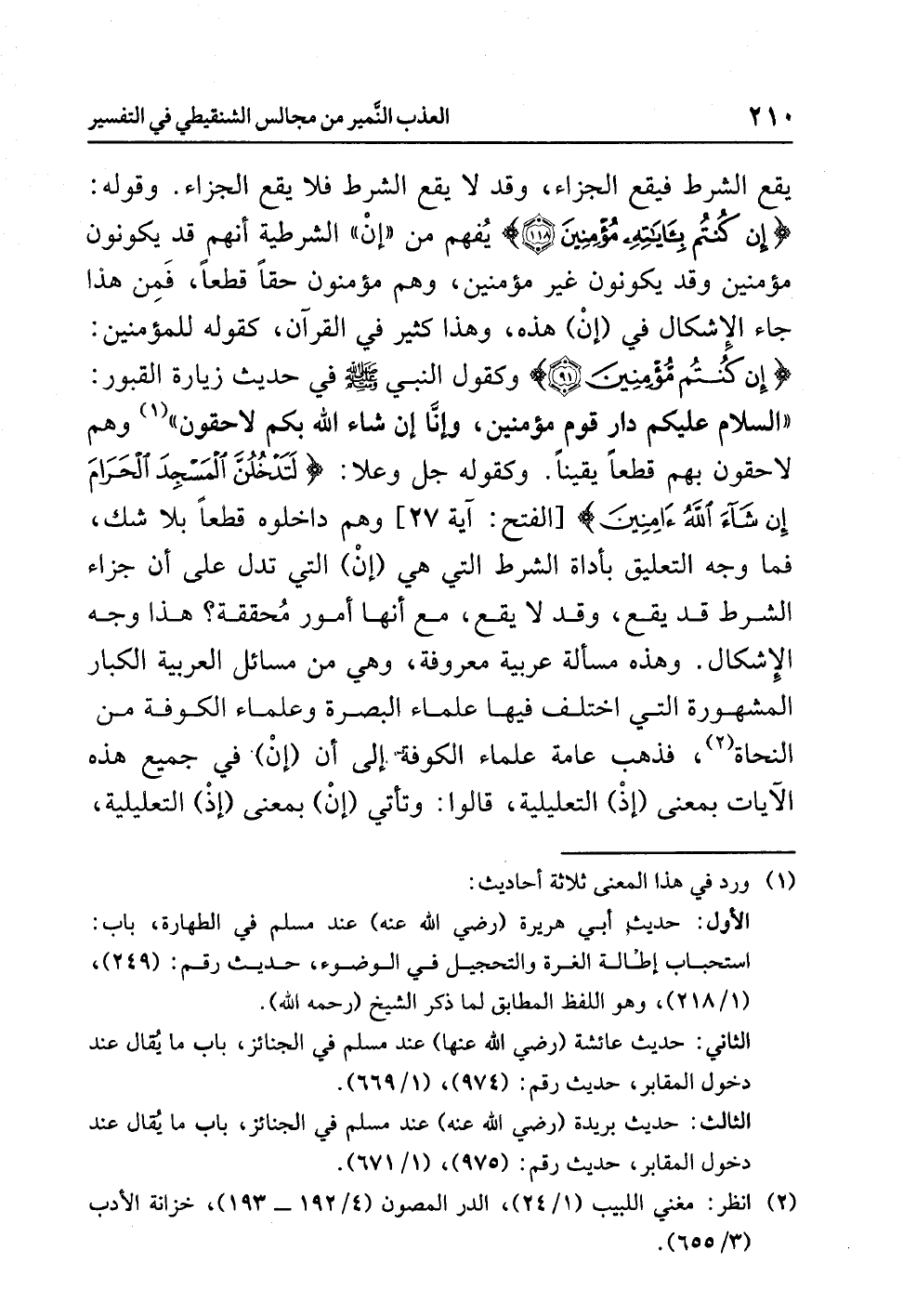 وهم لاحقونَ بهم قَطْعًا يَقِينًا. وكقولِه جل وعلا: {لَتَدْخُلُنَّ الْمَسْجِدَ الْحَرَامَ إِنْ شَاءَ اللَّهُ آمِنِينَ} [الفتح: آية 27] وهم دَاخِلُوهُ قَطْعًا بِلاَ شَكٍّ، فما وجهُ التعليقِ بأداةِ الشرطِ التي هي (إِنْ) التي تَدُلُّ على أَنَّ جزاءَ الشرطِ قد يَقَعُ، وقد لا يَقَعُ، مع أنها أمورٌ مُحَقَّقَةٌ؟ هذا وجهُ الإشكالِ. وهذه مسألةٌ عربيةٌ معروفةٌ، وهي من مسائلِ العربيةِ الكبارِ المشهورةِ التي اختلفَ فيها علماءُ البصرةِ وعلماءُ الكوفةِ من النحاةِ (¬2)، فَذَهَبَ عامةُ علماءِ الكوفةِ إلى أَنَّ (إِنْ) في جميعِ هذه الآياتِ بمعنَى (إذْ) التعليليةِ، قالوا: وَتَأْتِي (إنْ) بمعنَى (إِذْ) التعليليةِ،