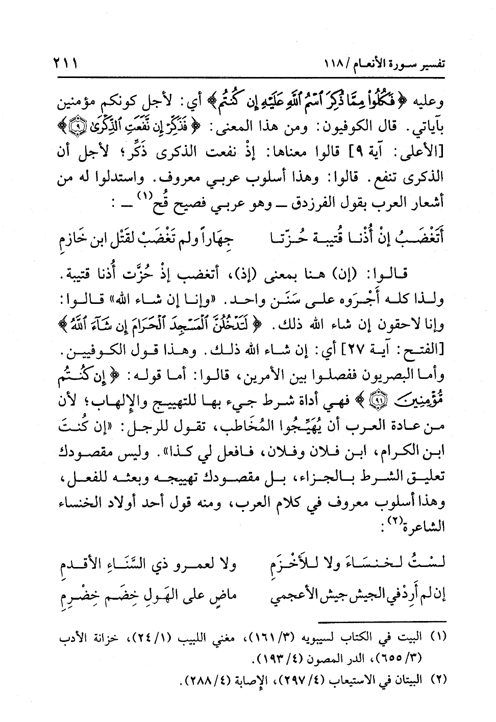 وعليه: {فَكُلُوا مِمَّا ذُكِرَ اسْمُ اللَّهِ عَلَيْهِ إِنْ كُنْتُمْ} أَيْ: لأَجْلِ كونِكم مؤمنينَ بآياتِي. قال الكوفيونَ: وَمِنْ هذا المعنَى: {فَذَكِّرْ إِن نَّفَعَتِ الذِّكْرَى (9)} [الأعلى: آية 9]، قالوا: مَعْنَاهَا: إِذْ نَفَعَتِ الذِّكْرَى ذَكِّرْ؛ لأَجْلِ أن الذِّكْرَى تنفعُ. قالوا: وهذا أسلوبٌ عربيٌّ معروفٌ. واستدلوا له من أشعارِ العربِ بقولِ الفرزدقِ- وهو عَرَبِيٌّ فصيحٌ قُحٌّ (¬1) -: