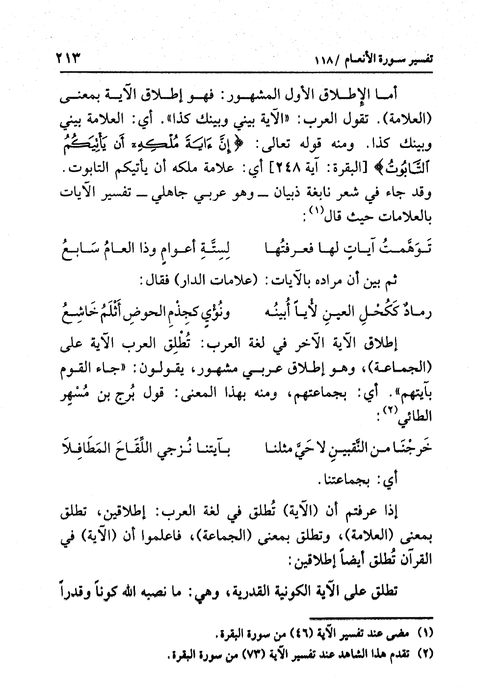أما الإطلاقُ الأولُ المشهورُ: فهو إطلاقُ الآيةِ بمعنَى (العلامةِ). تقولُ العربُ: «الآيةُ بَيْنِي وبينَك كذا». أي: العلامةُ بَيْنِي وبينَك كذا. ومنه قولُه تعالى: {إِنَّ آيَةَ مُلْكِهِ أَنْ يَأْتِيَكُمُ التَّابُوتُ} [البقرة: آية 248] أي: علامةُ مُلْكِهِ أن يأتيَكم التابوتُ. وقد جاءَ في شعرِ نابغةِ ذبيانَ- وهو عربيٌّ جاهليٌّ- تفسيرُ الآياتِ بالعلاماتِ حيث قال (¬1):