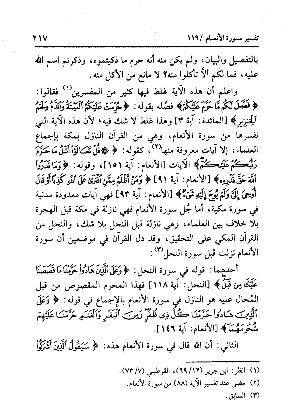 وَاعْلَمْ أن هذه الآيةَ غَلِطَ فيها كثيرٌ من المفسرين (¬1) فقالوا: {فَصَّلَ لَكُم مَّا حَرَّمَ عَلَيْكُمْ} فصَّلَهُ بقولِه: {حُرِّمَتْ عَلَيْكُمُ الْمَيْتَةُ وَالْدَّمُ وَلَحْمُ الْخِنْزِيرِ} [المائدة: آية 3] وهذا غلطٌ لا شكَّ فيه؛ لأن هذه الآيةَ التي نُفَسِّرُهَا من سورةِ الأنعامِ، وهي من القرآنِ النازلِ بمكةَ بإجماعِ علماء، إلا آياتٍ معروفةً منها (¬2)، كقولِه: {قُلْ تَعَالَوْا أَتْلُ مَا حَرَّمَ رَبُّكُمْ عَلَيْكُمْ} الآياتِ [الأنعام: آية 151]، وقوله: {وَمَا قَدَرُوا اللَّهَ حَقَّ قَدْرِهِ} [الأنعام: آية 91] {وَمَنْ أَظْلَمُ مِمَّنِ افْتَرَى عَلَى اللَّهِ كَذِبًا أَوْ قَالَ أُوحِيَ إِلَيَّ وَلَمْ يُوحَ إِلَيْهِ شَيْءٌ} [الأنعام: آية 93] فهي آياتٌ معدودةٌ مدنيةٌ في سورةٍ مكيةٍ، أما جُلُّ سورةِ الأنعامِ فهي نازلةٌ في مكةَ قبلَ الهجرةِ بلا خلافٍ بين العلماءِ، وهي نازلةٌ قبلَ النحلِ بلا شكٍّ، والنحلُ من القرآنِ المكيِّ على التحقيقِ، وقد دَلَّ القرآنُ في مَوْضِعَيْنِ أن سورةَ الأنعامِ نَزَلَتْ قبلَ سورةِ النحلِ (¬3):