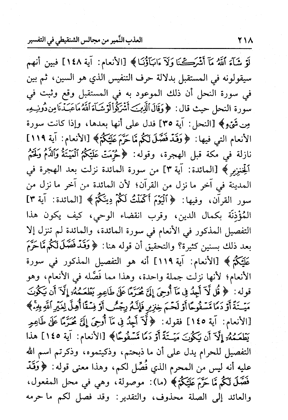 لَوْ شَاءَ اللَّهُ مَا أَشْرَكْنَا وَلاَ آبَاؤُنَا} [الأنعام: آية 148] فَبَيَّنَ أنهم سيقولونَه في المستقبلِ بدلالةِ حرفِ التنفيسِ الذي هو السينُ، ثم بَيَّنَ في سورةِ النحلِ أن ذلك الموعودَ به في المستقبلِ وَقَعَ وَثَبَتَ في سورةِ النحلِ حيث قال: {وَقَالَ الَّذِينَ أَشْرَكُوا لَوْ شَاءَ اللَّهُ مَا عَبَدْنَا مِنْ دُونِهِ مِنْ شَيْءٍ} [النحل: آية 35] فَدَلَّ على أنها بعدَها، وإذا كانت سورةُ الأنعامِ التي فيها: {وَقَدْ فَصَّلَ لَكُم مَّا حَرَّمَ عَلَيْكُمْ} [الأنعام: آية 119] نازلةً في مكةَ قبلَ الهجرةِ، وقولُه: {حُرِّمَتْ عَلَيْكُمُ الْمَيْتَةُ وَالْدَّمُ وَلَحْمُ الْخِنْزِيرِ} [المائدة: آية 3] من سورةِ المائدةِ نَزَلَتْ بعدَ الهجرةِ في المدينةِ في آخِرِ ما نَزَلَ من القرآنِ؛ لأَنَّ المائدةَ من آخِرِ ما نَزَلَ من سورِ القرآنِ، وفيها: {الْيَوْمَ أَكْمَلْتُ لَكُمْ دِينَكُمْ} [المائدة: آية 3] المُؤْذِنَة بكمالِ الدينِ وَقُرْبِ انقضاءِ الوحيِ، كيف يكونُ هذا التفصيلُ المذكورُ في الأنعامِ في سورةِ المائدةِ، والمائدةُ لَمْ تَنْزِلْ إلا بعدَ ذلك بسنينَ كثيرةٍ؟ والتحقيقُ أن قولَه هنا: {وَقَدْ فَصَّلَ لَكُم مَّا حَرَّمَ عَلَيْكُمْ} [الأنعام: آية 119] أنه هو التفصيلُ المذكورُ في سورةِ الأنعامِ؛ لأنها نَزَلَتْ جملةً واحدةً، وهذا مِمَّا فَصَّلَهُ في الأنعامِ، وهو قولُه: {قُل لاَّ أَجِدُ فِي مَا أُوحِيَ إِلَيَّ مُحَرَّمًا عَلَى طَاعِمٍ يَطْعَمُهُ إِلاَّ أَنْ يَكُونَ مَيْتَةً أَوْ دَمًا مَّسْفُوحًا أَوْ لَحْمَ خِنزِيرٍ فَإِنَّهُ رِجْسٌ أَوْ فِسْقًا أُهِلَّ لِغَيْرِ اللَّهِ بِهِ} [الأنعام: آية 145] فقولُه: {لاَّ أَجِدُ فِي مَا أُوحِيَ إِلَيَّ مُحَرَّمًا عَلَى طَاعِمٍ يَطْعَمُهُ إِلاَّ أَنْ يَكُونَ مَيْتَةً أَوْ دَمًا مَّسْفُوحًا} [الأنعام: آية 145] هذا التفصيلُ للحرامِ يدلُّ على أن ما ذَبَحْتُمْ وذكيتموه وذكرتم اسمَ اللَّهِ عليه أنه ليس من المحرمِ الذي فُصِّلَ لكم، وهذا معنَى قولِه: {وَقَدْ فَصَّلَ لَكُم مَّا