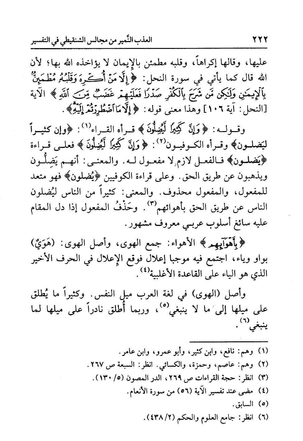 وقولُه: {وَإِنَّ كَثِيرًا لَّيُضِلُّونَ} قرأه القراءُ (¬1): {وإن كثيرًا ليَضلونَ} وقرأه الكوفيون (¬2): {وَإِنَّ كَثِيرًا لَّيُضِلُّونَ} فعلى قراءةِ {يَضِلُّونَ} فالفعلُ لازمٌ لا مفعولَ له. والمعنَى: أنهم يَضِلُّون ويذهبونَ عن طريقِ الحقِّ. وعلى قراءةِ الكوفيين {يُضلون} فهو متعدٍّ للمفعولِ، والمفعولُ محذوفٌ. والمعنَى: كثيرًا من الناسِ ليُضلون الناسَ عن طريقِ الحقِّ بأهوائهم (¬3). وحَذْفُ المفعولِ إذا دَلَّ المقامُ عليه سائغٌ أسلوبٌ عربيٌّ معروفٌ مشهورٌ.