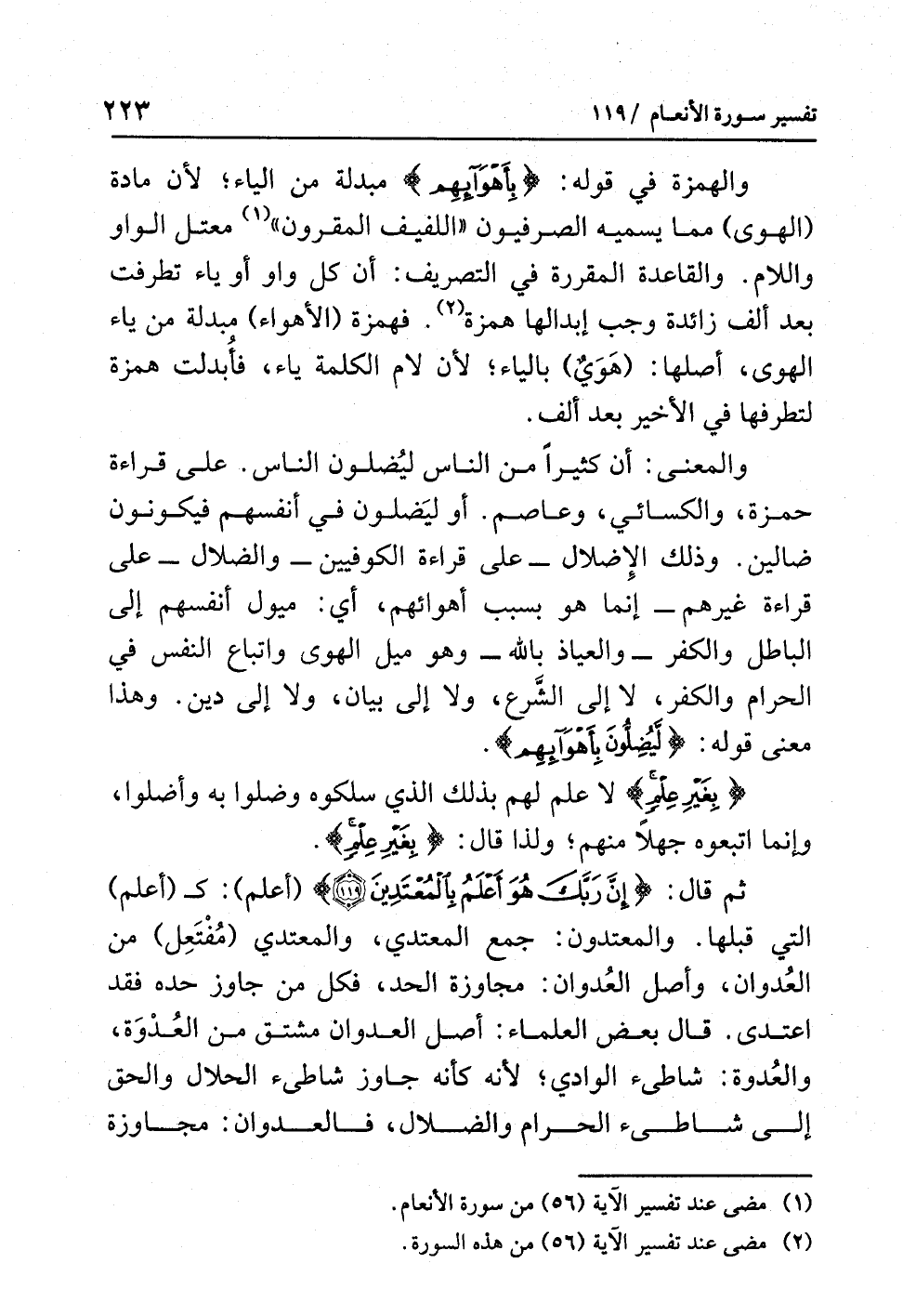 ثم قال: {إِنَّ رَبَّكَ هُوَ أَعْلَمُ بِالْمُعْتَدِينَ (119)} (أعلم): كـ (أعلم) التي قبلَها. والمعتدونَ: جمعُ المعتدِي، والمعتدِي (مُفْتَعِل) من العُدْوَانِ، وأصلُ العُدوانِ: مجاوزةُ الحدِّ، فَكُلُّ مَنْ جَاوَزَ حدَّه فقد اعتدى. قال بعضُ العلماءِ: أصلُ العدوانِ مشتقٌّ من العُدْوَةِ، والعُدوة: شاطئُ الوادي؛ لأنه كأنه جاوزَ شاطئَ الحلالِ والحقِّ إلى شاطئ الحرامِ والضلالِ، فالعدوانُ: مجاوزةُ