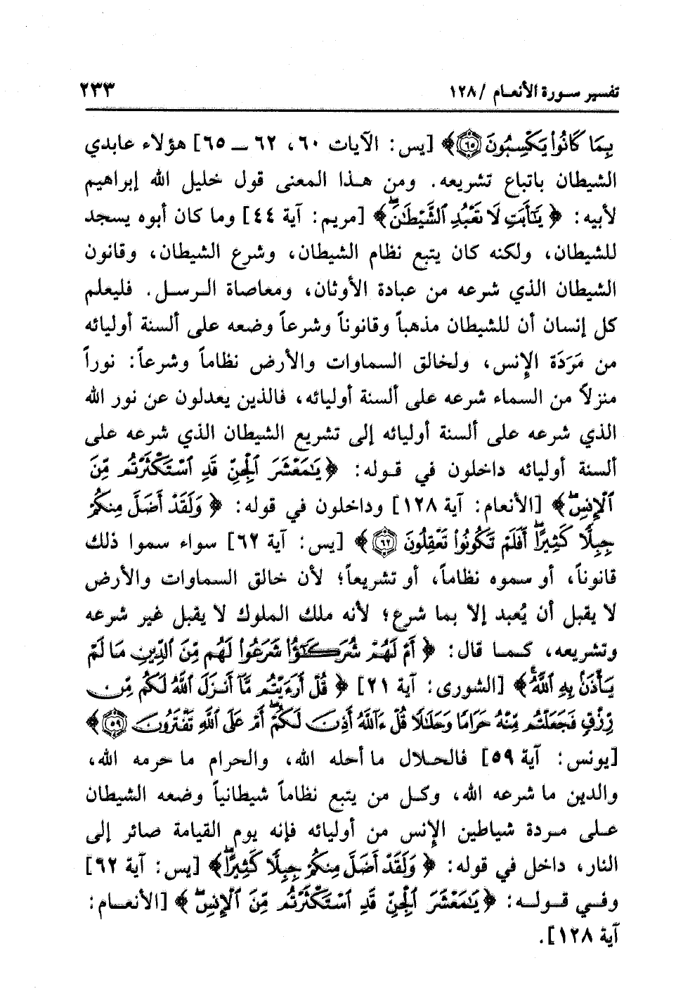 بِمَا كَانُوا يَكْسِبُونَ (65)} [يس: الآيات 60، 62 - 65] هؤلاء عَابِدِي الشيطانِ باتباعِ تشريعِه. ومن هذا المعنَى قولُ خليلِ اللَّهِ إبراهيمَ لأَبِيهِ: {يَا أَبَتِ لاَ تَعْبُدِ الشَّيْطَانَ} [مريم: آية 44] وما كان أبوه يسجدُ للشيطانِ، ولكنه كان يتبعُ نظامَ الشيطانِ وَشَرْعَ الشيطانِ وقانونَ الشيطانِ الذي شَرَعَهُ من عبادةِ الأوثانِ ومعاصاةِ الرسلِ.