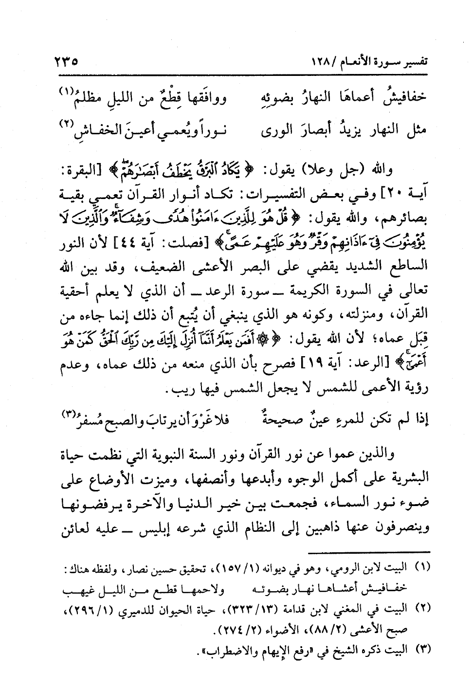 وَاللَّهُ (جل وعلا) يقولُ: {يَكَادُ الْبَرْقُ يَخْطَفُ أَبْصَارَهُمْ} [البقرة: آية20] وفي بعضِ التفسيراتِ: تكادُ أنوارُ القرآنِ تُعْمِي بقيةَ بصائرِهم، واللَّهُ يقولُ: {قُلْ هُوَ لِلَّذِينَ آمَنُوا هُدًى وَشِفَاءٌ وَالَّذِينَ لاَ يُؤْمِنُونَ فِي آذَانِهِمْ وَقْرٌ وَهُوَ عَلَيْهِمْ عَمًى} [فصلت: آية 44] لأن النورَ الساطعَ الشديدَ يَقْضِي على البصرِ الأَعْشَى الضعيفِ، وقد بَيَّنَ اللَّهُ تعالى في السورةِ الكريمةِ- سورةِ الرعدِ- أن الذي لا يعلمُ أحقيةَ القرآنِ ومنزلتَه وكونَه هو الذي ينبغي أن يُتَّبَعَ أن ذلك إنما جاءَه مِنْ قِبَلِ عَمَاهُ؛ لأَنَّ اللَّهَ يقولُ: {أَفَمَنْ يَعْلَمُ أَنَّمَا أُنْزِلَ إِلَيْكَ مِنْ رَبِّكَ الْحَقُّ كَمَنْ هُوَ أَعْمَى} [الرعد: آية 19] فَصَرَّحَ بأن الذي مَنَعَهُ من ذلك عَمَاهُ، وعدمُ رؤيةِ الأَعْمَى للشمسِ لا يجعلُ الشمسَ فيها رَيْبٌ.