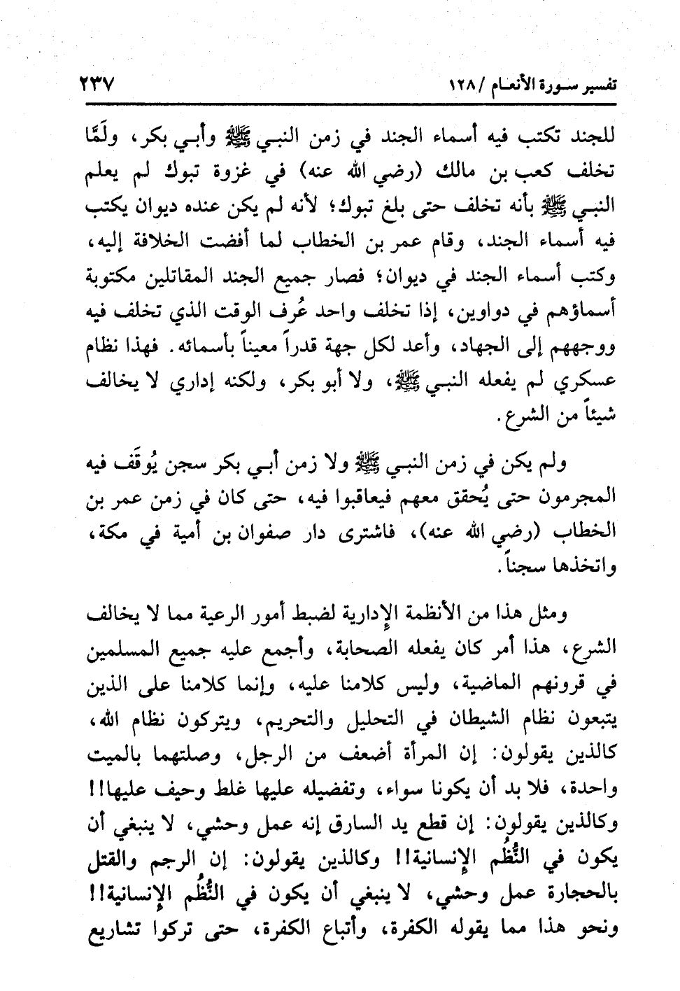 ومثلُ هذا من الأنظمةِ الإداريةِ لضبطِ أمورِ الرعيةِ مما لا يخالفُ الشرعَ، هذا أمرٌ كان يفعلُه الصحابةُ، وأجمعَ عليه جميعُ المسلمينَ في قرونِهم الماضيةِ، وليس كلامُنا عليه، وإنما كلامُنا على الذين يتبعونَ نظامَ الشيطانِ في التحليلِ والتحريمِ، ويتركونَ نظامَ اللَّهِ، كالذين يقولونَ: إن المرأةَ أضعفُ من الرجلِ، وَصِلَتُهُمَا بالميتِ واحدةٌ، فلابدَّ أن يكونَا سواءً، وتفضيلُه عليها غلطٌ وَحَيْفٌ عليها!! وكالذين يقولونَ: إن قَطْعَ يدِ السارقِ إنه عملٌ وحشيٌّ، لا ينبغي أن يكونَ في النُّظُمِ الإنسانيةِ!! وكالذين يقولونَ: إن الرجمَ والقتلَ بالحجارةِ عملٌ وحشيٌّ، لا ينبغي أن يكونَ في النُّظُمِ الإنسانيةِ!! ونحو هذا مما يقولُه الكفرةُ وأتباعُ الكفرةِ، حتى تَرَكُوا تشاريعَ