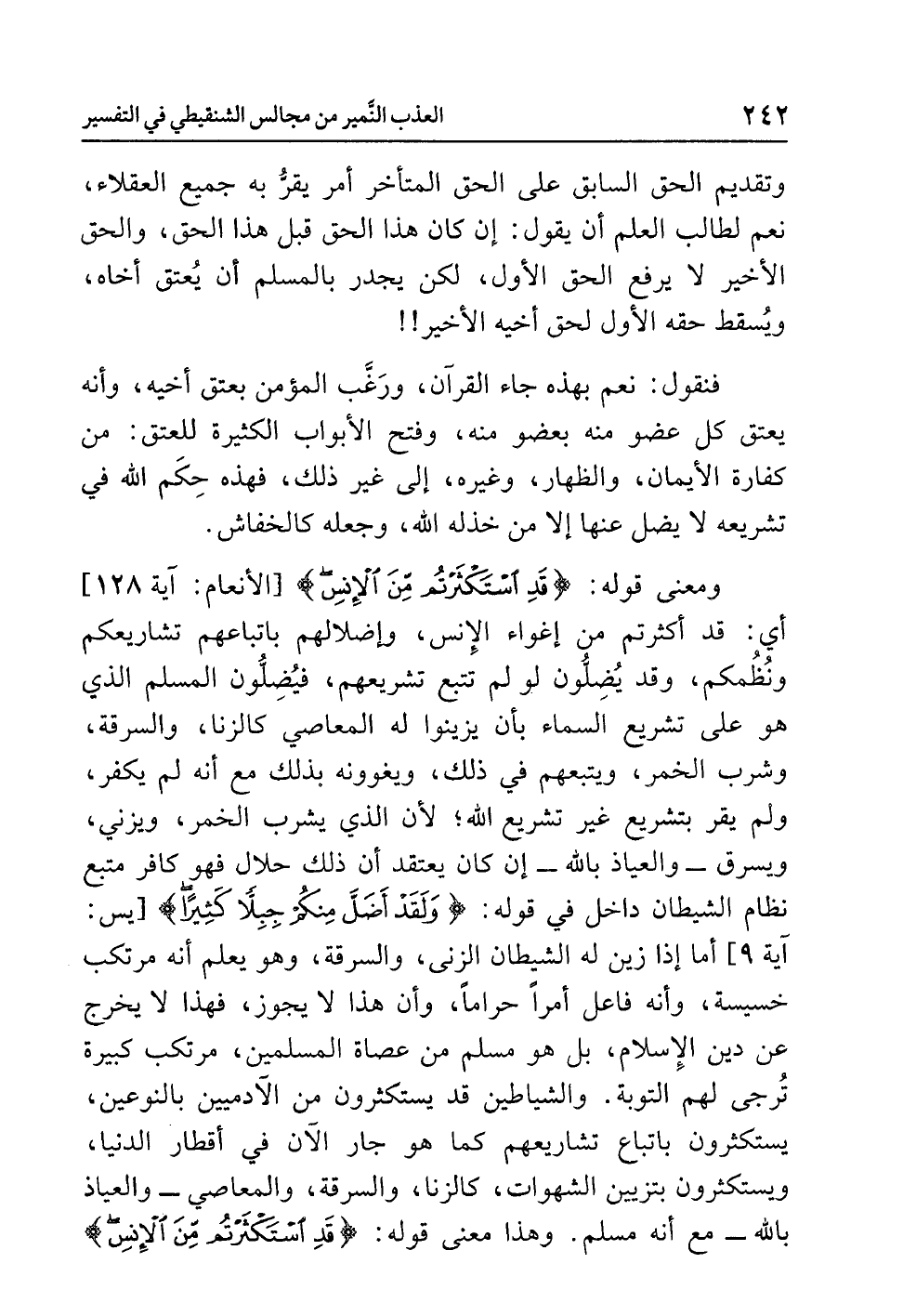 ومعنَى قولِه: {قَدِ اسْتَكْثَرْتُم مِّنَ الإِنْسِ} [الأنعام: آية 128] أي: قَدْ أَكْثَرْتُمْ من إغواءِ الإنسِ، وإضلالِهم باتباعهم تشاريعَكم ونُظُمَكم، وقد يُضِلون لو لم تتبع تشريعهم، فيُضِلُّون المسلمَ الذي هو على تشريعِ السماءِ بأن يُزَيِّنُوا له المعاصيَ كالزنا والسرقة وَشُرْبِ الخمرِ ويتبعهم في ذلك، ويغوونه بذلك مع أنه لم يَكْفُرْ، ولم يُقِرَّ بتشريعٍ غيرِ تشريعِ الله؛ لأَنَّ الذي يشربُ الخمرَ ويزني ويسرقُ- والعياذُ بِاللَّهِ- إن كان يعتقدُ أن ذلك حلالٌ فهو كافرٌ متبعٌ نظامَ الشيطانِ داخلٌ في قولِه: {وَلَقَدْ أَضَلَّ مِنْكُمْ جِبِلاًّ كَثِيرًا} [يس: آية 62] أما إذا زَيَّنَ له الشيطانُ الزنى والسرقةَ وهو يعلمُ أنه مرتكبٌ خسيسةً، وأنه فاعلٌ أَمْرًا حَرَامًا، وأن هذا لا يجوزُ فهذا لا يَخْرُحُ عن دينِ الإسلامِ، بل هو مسلمٌ مِنْ عُصَاةِ المسلمين، مرتكبٌ كبيرةً تُرْجَى لهم التوبةُ. والشياطينُ قد يستكثرونَ من الآدميين بِالنَّوْعَيْنِ، يستكثرونَ باتباعِ تشاريعِهم كما هو جَارٍ الآنَ في أقطارِ الدنيا، ويستكثرونَ بتزيينِ الشهواتِ كالزِّنَا والسرقةِ والمعاصِي- والعياذُ بالله- مع أنه مسلمٌ. وهذا معنَى قولِه: {قَدِ اسْتَكْثَرْتُم مِّنَ الإِنْسِ}