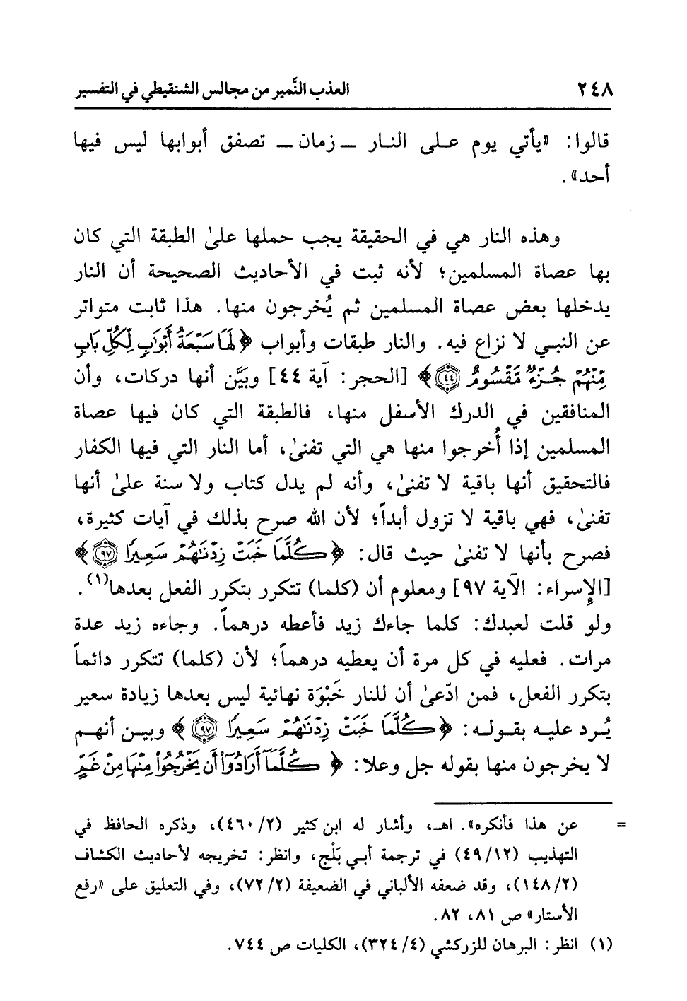 وهذه النارُ هي في الحقيقةِ يجبُ حَمْلُهَا على الطبقةِ التي كان بها عصاةُ المسلمينَ؛ لأنه ثَبَتَ في الأحاديثِ الصحيحةِ أن النارَ يَدْخُلُهَا بعضُ عصاةِ المسلمين ثم يُخْرَجُونَ منها. هذا ثابتٌ متواترٌ عن النبيِّ لا نزاعَ فيه. والنارُ طبقاتٌ وأبوابٌ: {لَهَا سَبْعَةُ أَبْوَابٍ لِّكُلِّ بَابٍ مِّنْهُمْ جُزْءٌ مَّقْسُومٌ (44)} [الحجر: آية 44] وبَيَّنَ أنها دركاتٌ، وأن المنافقين في الدركِ الأسفلِ منها، فالطبقةُ التي كان فيها عصاةُ المسلمينَ إذا أُخْرِجُوا منها هي التي تَفْنَى، أما النارُ التي فيها الكفارُ فالتحقيقُ أنها باقيةٌ لا تَفْنَى، وأنه لم يَدُلَّ كتابٌ ولا سُنَّةٌ على أنها تَفْنَى، فهي باقيةُ لا تزولُ أَبَدًا؛ لأَنَّ اللَّهَ صَرَّحَ بذلك في آياتٍ كثيرةٍ، فَصَرَّحَ بأنها لا تَفْنَى حيث قال: {كُلَّمَا خَبَتْ زِدْنَاهُمْ سَعِيرًا (97)} [الإسراء: الآية 97]، ومعلومٌ أن (كلما) تَتَكَرَّرُ بِتَكَرُّرِ الفعلِ بَعْدَهَا (¬1).