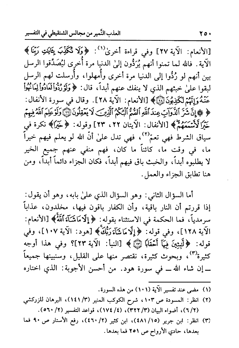 أما السؤالُ الثاني: وهو السؤالُ الذي على بابِه، وهو أن يقولَ: إذا قَرَّرْتُمْ أن النارَ باقيةٌ، وأن الكفارَ بَاقُونَ فيها مخلدونَ، عَذَابًا سَرْمَدِيًّا، فما الحكمةُ في الاستثناءِ بقولِه: {إِلاَّ مَا شَاءَ اللَّهُ} [الأنعام: الآية 128] وفي قولِه: {إِلاَّ مَا شَاءَ رَبُّكَ} [هود: الآية 107] وفي قولِه: {لاَبِثِينَ فِيهَا أَحْقَابًا (23)} [النبأ: الآية 23]؟ وفي هذا أوجهٌ كثيرةٌ (¬3)، وبحوثٌ كثيرةٌ نقتصرُ منها على القليلِ، وَسَنُبَيِّنُهَا جميعًا- إن شاءَ اللَّهُ- في سورةِ هودٍ.