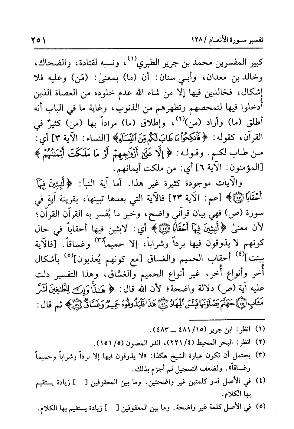 والآياتُ موجودةٌ كثيرةٌ غيرُ هذا. أما آيةُ النبأِ: {لاَبِثِينَ فِيهَا أَحْقَابًا (23)} [عم: الآية 23] فالآيةُ التي بعدَها تُبَيِّنُهَا، بقرينةِ آيةٍ فِي سورةِ (ص) فَهِيَ بيانٌ قُرْآنِيٌّ وَاضِحٌ، وخيرُ ما يُفَسَّرُ به القرآنُ القرآنُ؛ لأَنَّ معنَى: {لاَبِثِينَ فِيهَا أَحْقَابًا (23)} أي: لاَبِثِينَ فيها أَحْقَابًا فِي حالِ كونِهم لاَ يذوقونَ فيها بَرْدًا وَشَرَابًا إلا حميمًا (¬3) وغساقًا. [فالآيةُ بَيَّنَتْ] (¬4) أحقابَ الحميمِ والغساقِ [مع كونِهم يُعَذَّبُونَ] (¬5) بأشكالٍ أُخَرَ وأنواعٍ أُخَرَ، غيرِ أنواعِ الحميمِ والغسَّاقِ، وهذا التفسيرُ دَلَّتْ عليه آيةُ (ص) دلالةً واضحةً؛ لأَنَّ اللَّهَ قال: {هَذَا وَإِنَّ لِلطَّاغِينَ لَشَرَّ مَآبٍ (55) جَهَنَّمَ يَصْلَوْنَهَا فَبِئْسَ الْمِهَادُ (56) هَذَا فَلْيَذُوقُوهُ حَمِيمٌ وَغَسَّاقٌ (57)} ثم قال: