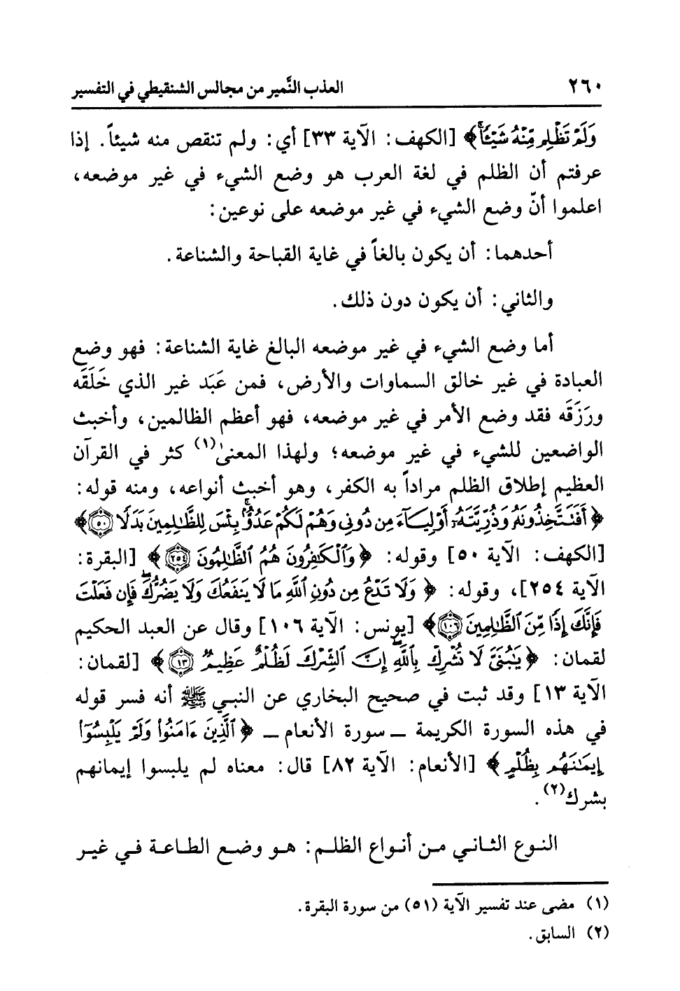وَلَمْ تَظْلِمْ مِنْهُ شَيْئًا} [الكهف: الآية 33] أي: ولم تَنْقُصْ منه شَيْئًا. إذا عَرَفْتُمْ أن الظلمَ في لغةِ العربِ هو وضعُ الشيءِ في غيرِ موضعِه، اعلموا أَنَّ وضعَ الشيءِ في غيرِ موضعِه على نَوْعَيْنِ: