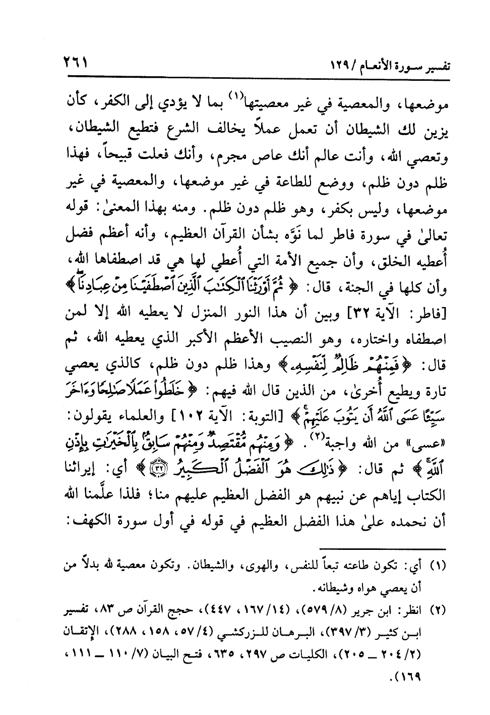 موضعِها، والمعصيةِ في غيرِ معصيتِها (¬1) بما لا يُؤَدِّي إلى الكفرِ، كَأَنْ يُزَيِّنَ لكَ الشيطانُ أن تعملَ عَمَلاً يُخَالِفُ الشرعَ فتطيعُ الشيطانَ، وتعصِي اللَّهَ، وأنتَ عَالِمٌ أَنَّكَ عاصٍ مُجْرِمٌ، وأنكَ فعلتَ قبيحًا، فهذا ظلمٌ دونَ ظلمٍ، ووضعٌ للطاعةِ في غيرِ موضعِها، والمعصيةِ في غيرِ موضعِها، وليسَ بِكُفْرٍ، وهو ظلمٌ دونَ ظلمٍ. ومنه بهذا المعنَى: قولُه تعالى في سورةِ (فاطر) لَمَّا نَوَّهَ بشأنِ القرآنِ العظيمِ، وأنه أعظمُ فضلٍ أُعْطِيهِ الخلق، وأن جميعَ الأمةِ التي أُعْطِيَ لها هي قد اصطفاها اللَّهُ، وأن كُلَّهَا في الجنةِ، قال: {ثُمَّ أَوْرَثْنَا الْكِتَابَ الَّذِينَ اصْطَفَيْنَا مِنْ عِبَادِنَا} [فاطر: الآية 32] وَبَيَّنَ أن هذا النورَ الْمُنَزَّلَ لا يُعْطِيهِ اللَّهُ إلا لِمَنِ اصطفاهُ واختارهُ، وهو النصيبُ الأعظمُ الأكبرُ الذي يُعْطِيهِ اللَّهُ، ثم قال: {فَمِنْهُمْ ظَالِمٌ لِّنَفْسِهِ} وهذا ظلمٌ دونَ ظلمٍ، كالذي يَعْصِي تارةً ويطيعُ أخرى، مِنَ الذين قال اللَّهُ فيهم: {خَلَطُوا عَمَلاً صَالِحًا وَآخَرَ سَيِّئًا عَسَى اللَّهُ أَنْ يَتُوبَ عَلَيْهِمْ} [التوبة: الآية 102] والعلماءُ يقولونَ: «عسى» مِنَ اللَّهِ واجبةٌ (¬2).
