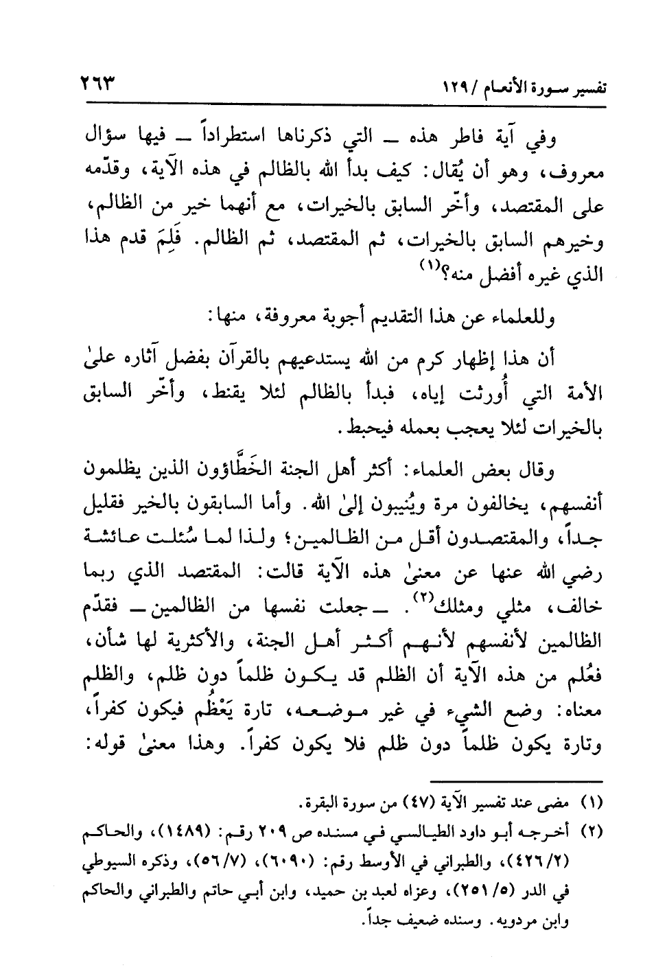 وفي آيةِ فاطر هذه- التي ذَكَرْنَاهَا استطرادًا- فيها سؤالٌ معروفٌ، وهو أن يُقَالَ: كيف بدأ اللَّهُ بالظالمِ في هذه الآيةِ، وَقَدَّمَهُ على المقتصدِ، وَأَخَّرَ السابقَ بالخيراتِ، مع أنهما خيرٌ من الظالمِ، وخيرُهم السابقُ بالخيراتِ، ثم المقتصدُ، ثم الظالمُ. فَلِمَ قَدَّمَ هذا الذي غيرُه أفضلُ منه (¬1)؟