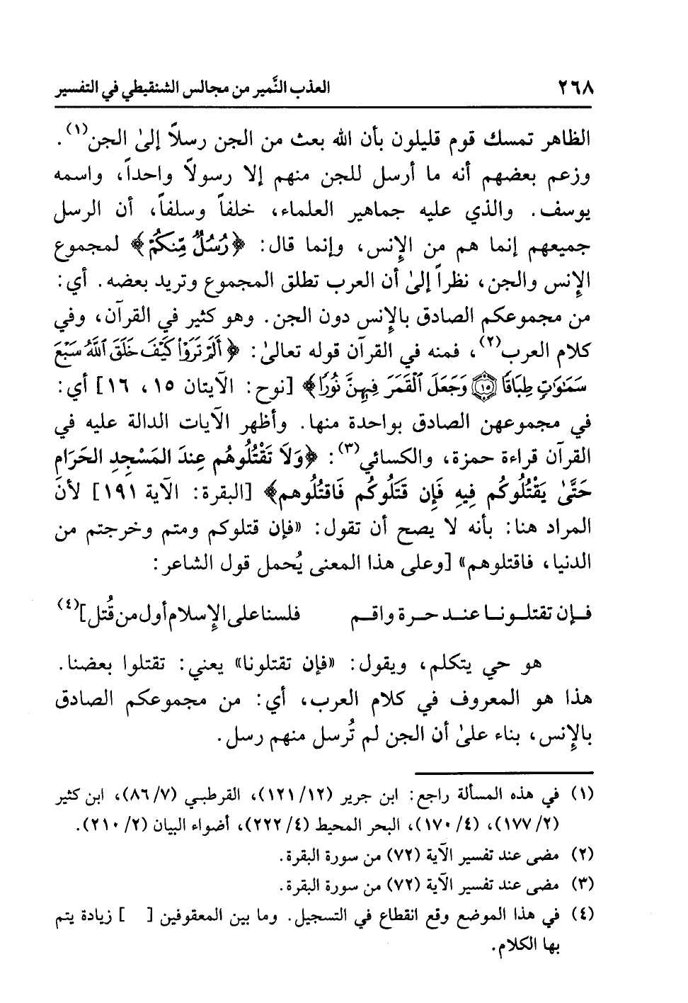 والذي عليه جماهيرُ العلماءِ، خَلَفًا وَسَلَفًا، أن الرسلَ جميعَهم إنما هُمْ من الإنسِ، وإنما قَالَ: {رُسُلٌ مِّنكُمْ} لِمَجْمُوعِ الإنسِ والجنِّ، نَظَرًا إلى أن العربَ تُطْلِقُ المجموعَ وتريدُ بعضَه. أي: من مجموعِكم الصادقِ بالإنسِ دونَ الجنِّ. وهو كثيرٌ في القرآنِ، وفي كلامِ العربِ (¬2)، فَمِنْهُ في القرآنِ قولُه تعالى: {أَلَمْ تَرَوْا كَيْفَ خَلَقَ اللَّهُ سَبْعَ سَمَاوَاتٍ طِبَاقًا (15) وَجَعَلَ الْقَمَرَ فِيهِنَّ نُورًا} [نوح: الآيتان 15، 16]، أي: في مجموعِهن الصادقِ بواحدةٍ منها. وأظهرُ الآياتِ الدالةِ عليه في القرآنِ قراءةُ حمزةَ والكسائيِّ (¬3): {وَلاَ تَقْتُلُوهُم عِنْدَ الْمَسْجِدِ الْحَرَامِ حَتَّى يَقْتُلُوكُمْ فِيهِ فَإِنْ قَتَلُوكُمْ فَاقْتُلُوهُمْ} [البقرة: الآية 191] لأن المرادَ هنا: بأنه لا يصحُّ أن تقولَ: «فإن قَتَلُوكُمْ ومتم وخرجتُم من الدنيا فَاقْتُلُوهُمْ» [وعلى هذا المعنَى يُحْمَلُ قولُ الشاعرِ: